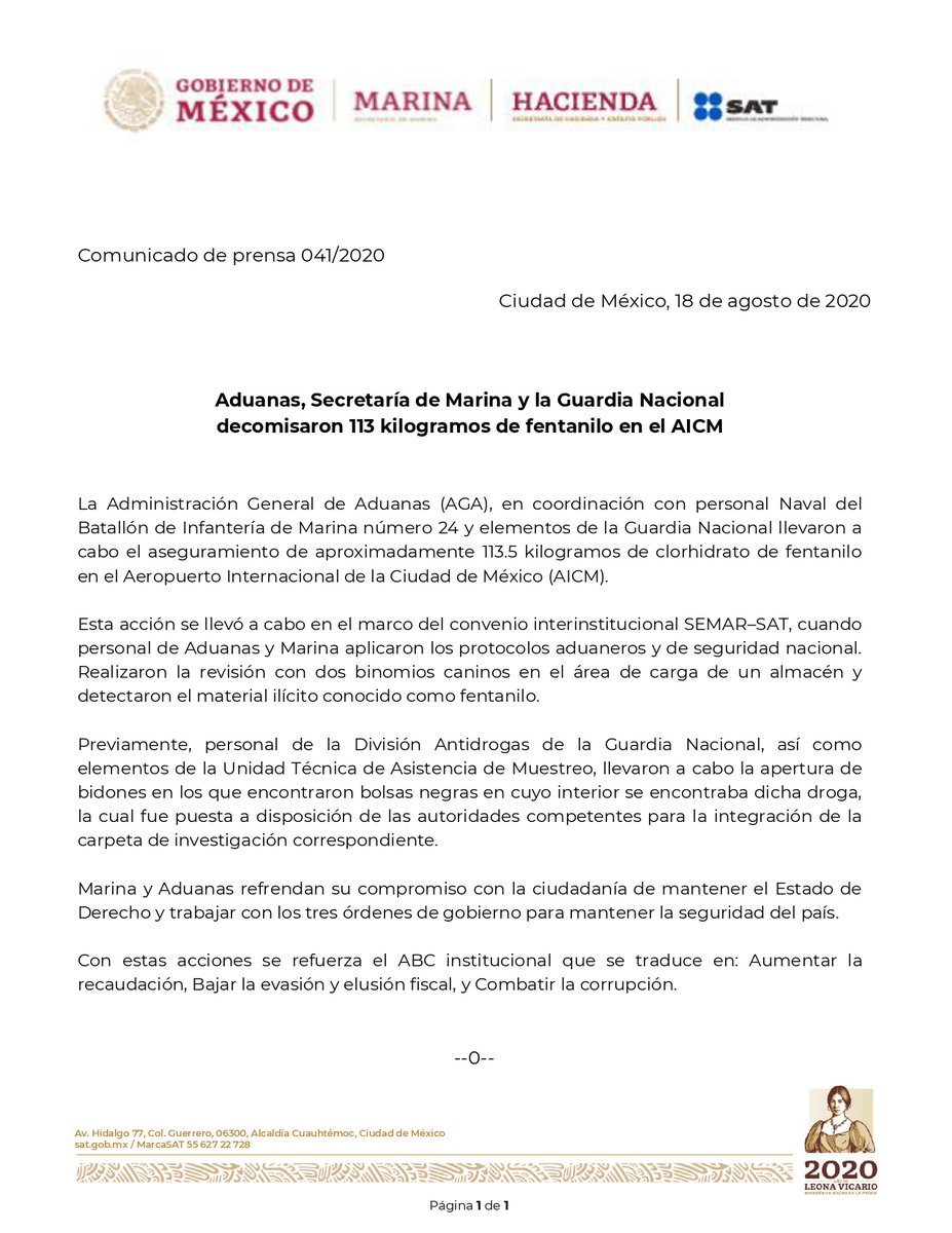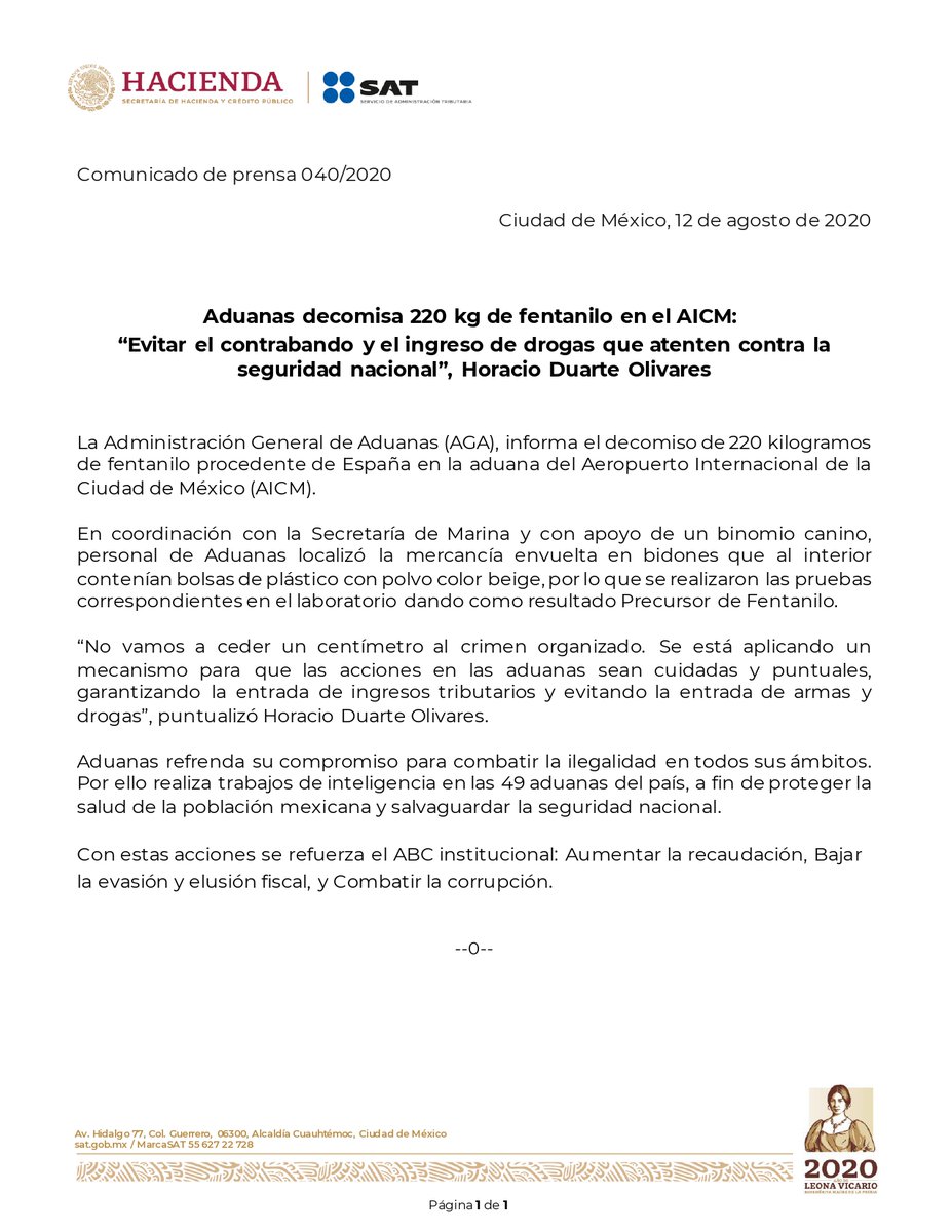 Aduanas decomisa 220 kg de fentanilo en el AICM: