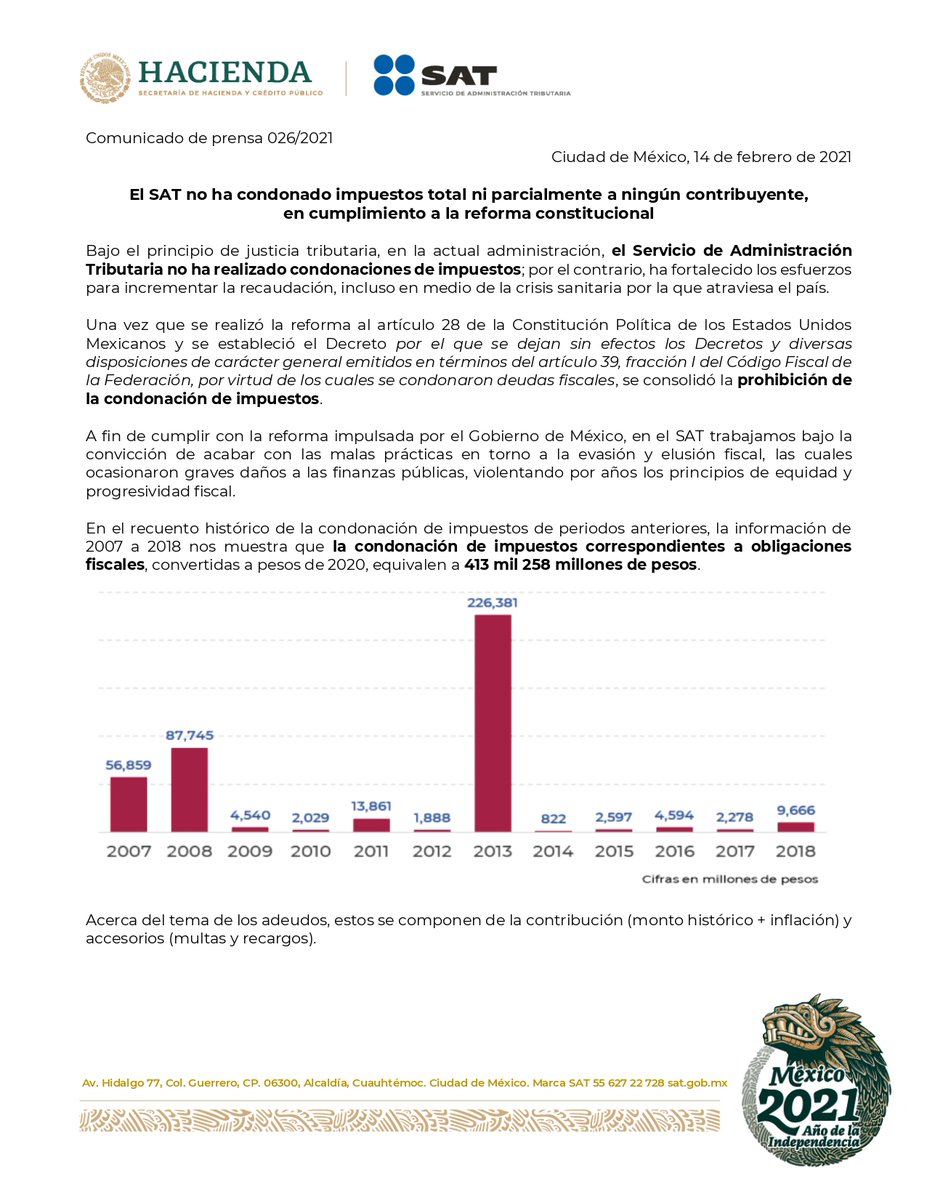 Con justicia tributaria, piso parejo y cero impunidad, el SAT no ha condonado, ni total ni parcialmente impuestos; al contrario, promueve la regularización de contribuyentes sin judicialización.