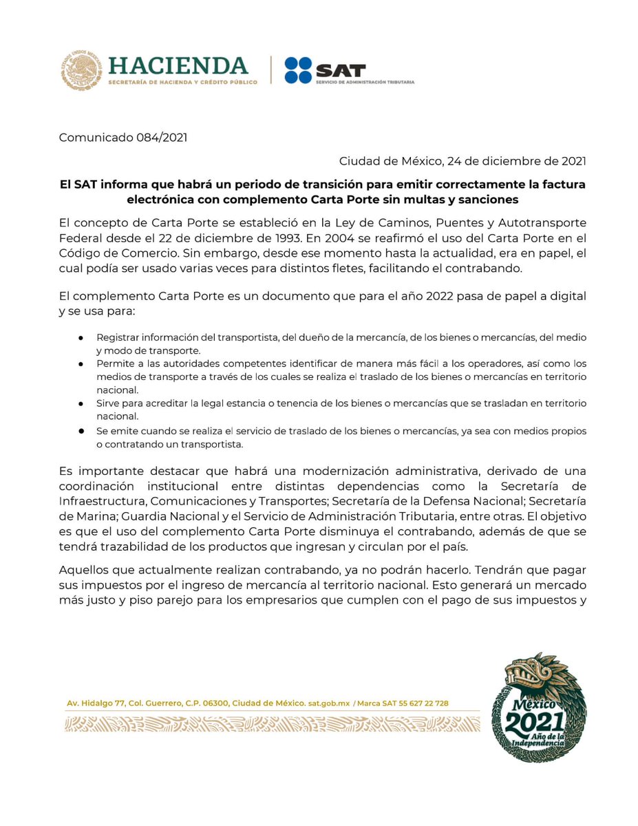 El SAT informa que habrá un periodo de transición para emitir correctamente la factura electrónica con complemento Carta Porte sin multas y sanciones.