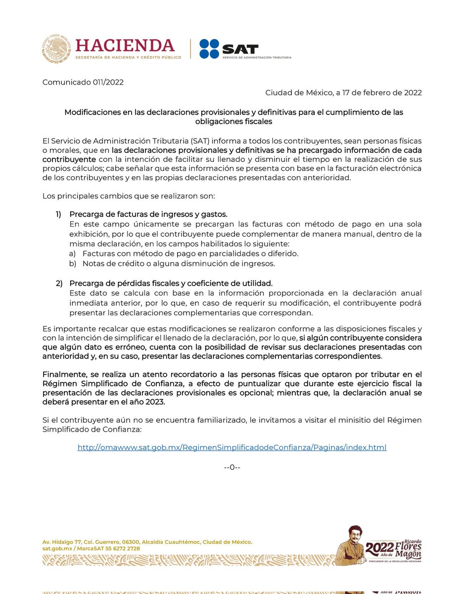 El SAT anuncia que en las declaraciones provisionales y definitivas se ha precargado información para facilitar el llenado a los contribuyentes.
