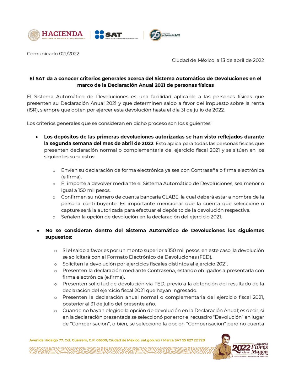 El SAT da a conocer los criterios generales del Sistema Automático de Devoluciones para las personas físicas que presenten su Declaración Anual 2021 y determinen saldo a favor de ISR.