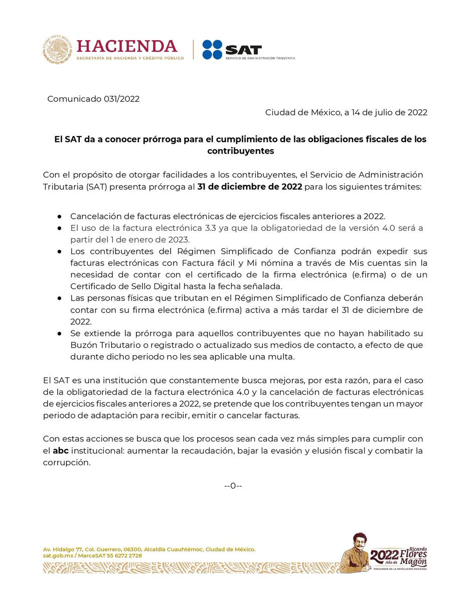 El SAT anuncia prórroga al 31 de diciembre de 2022 para distintos trámites con la finalidad de que los contribuyentes cumplan adecuadamente.