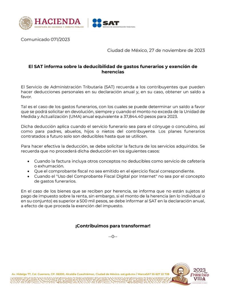 El SAT recuerda a los contribuyentes que los gastos funerarios son deducibles del pago de impuesto sobre la renta (ISR) en la declaración anual, para poder obtener, en su caso, saldo a favor.