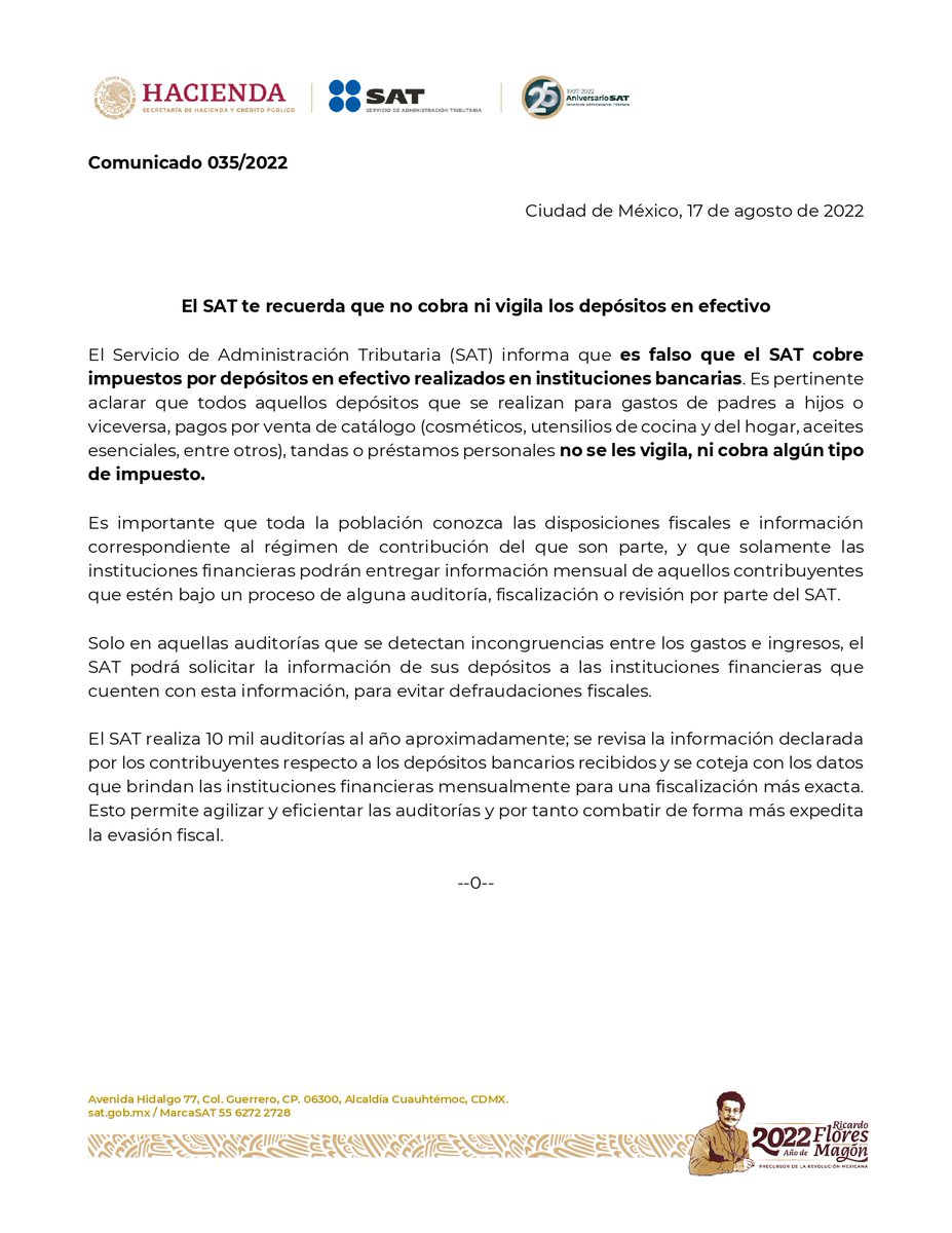 El SAT informa que es falso el cobro de impuestos por depósitos en efectivo realizados en instituciones bancarias, por ejemplo, los realizados de padres a hijos o viceversa, pagos por venta de catálogo, tandas o préstamos personales.
