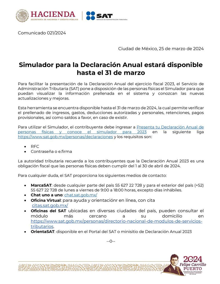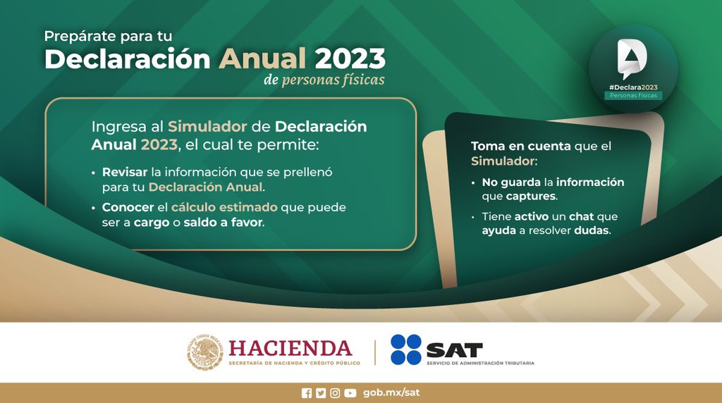 El SAT informa que, hasta el 31 de marzo, se encuentra disponible el Simulador para la Declaración Anual 2023 de personas físicas, herramienta que permite verificar el prellenado de ingresos, gastos, deducciones autorizadas y personales, retenciones, pagos