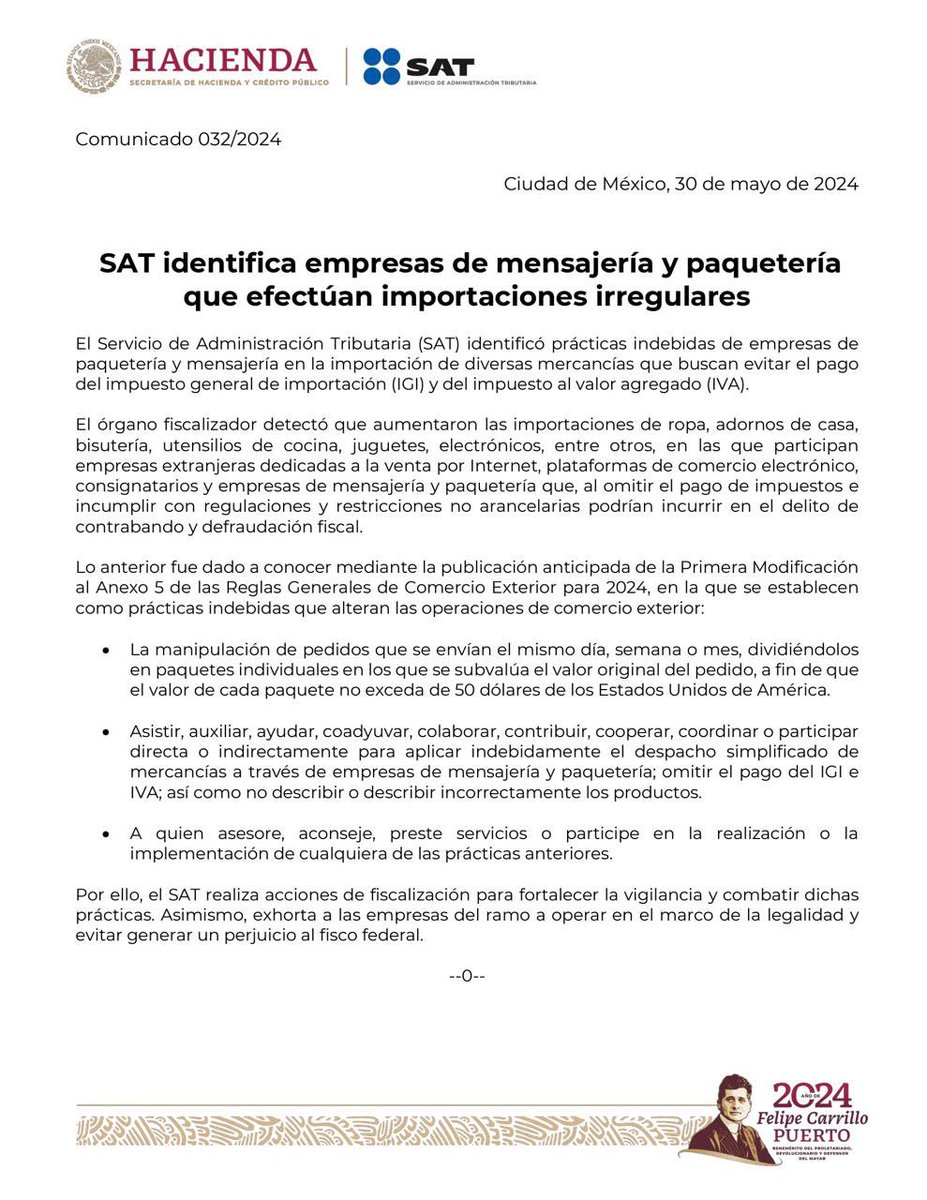 El SAT informa que identificó importaciones irregulares de empresas de paquetería y mensajería, por lo cual publicó la Primera Modificación al Anexo 5 de las Reglas Generales de Comercio Exterior para 2024, en la que se dan a conocer cuáles son las prácticas