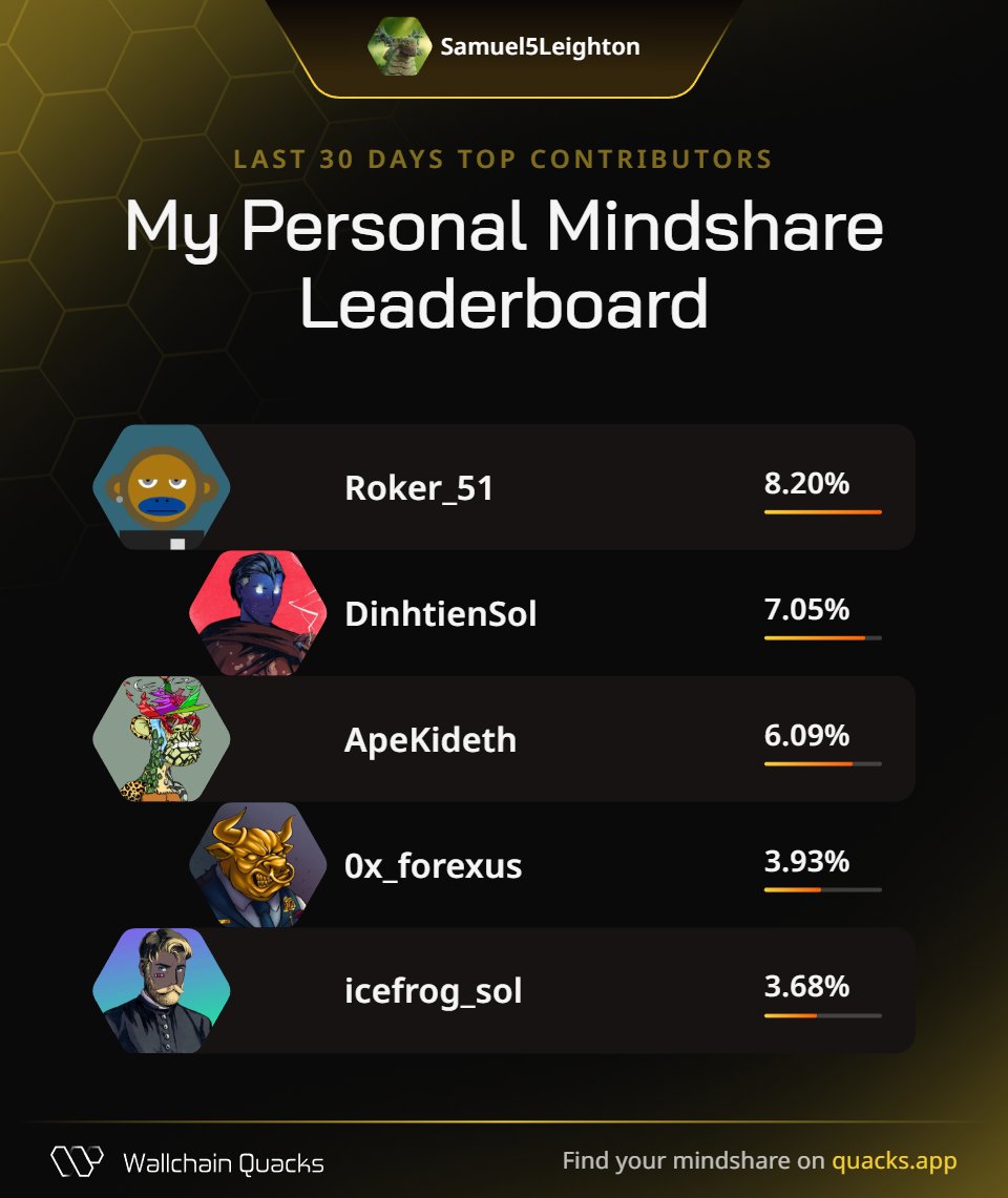 Just launched my Personal Mindshare Leaderboard on @wallchain 🦆 Massive thanks to everyone driving the most valuable mindshare with me this month: @Roker_51 – Idea ignition catalyst @DinhtienSol – Creative horizon shaper @ApeKideth – Discovery navigator @0x_forexus – Direction finder @icefrog_sol – Crypto fan predator Champion your strongest supporters. Launch yours now 👉 quacks.app/?ref=Samuel5Le…