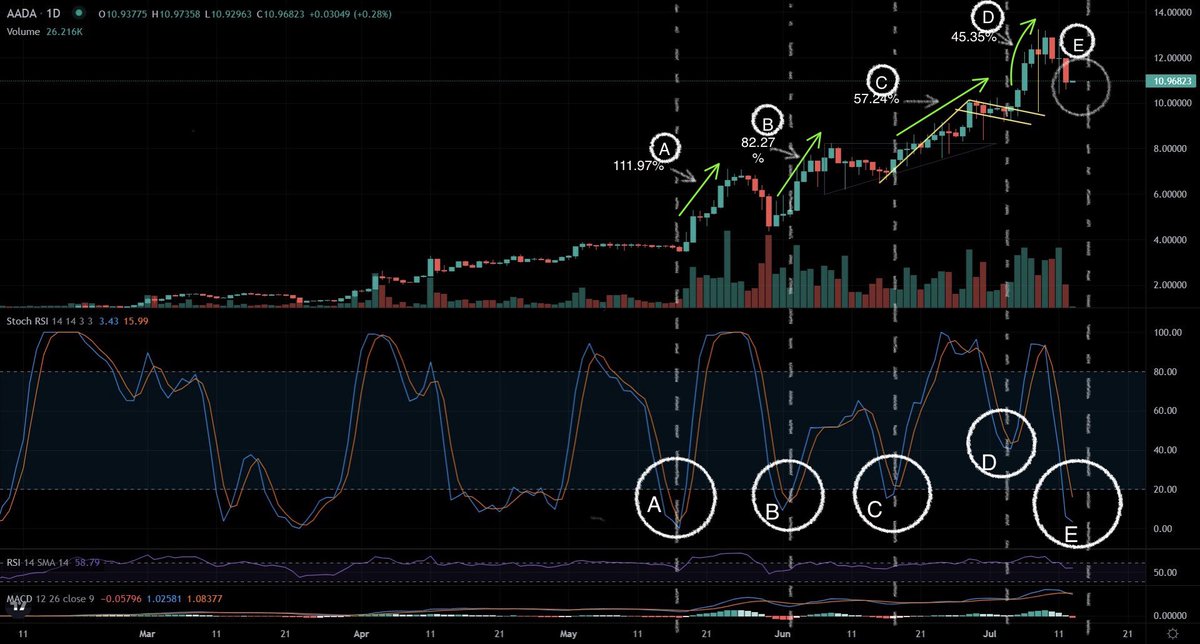 This Golden Buy Opportunity Might Be Coming To An End According to @LenfiOfficial 1 day CHART. Read Up 👇🏾 Pay attention to the circle labelled A right at the stochastic RSI, you can see that the blue & orange line came down under the 20 level for a full reset of the stochastic RSI. Now TRACK the white dotted line I drew all the way to the price action candles above, as soon as the blue line crossed above the orange line over the 20 level, PRICE TOOK OFF as signified with the green arrow LABELLED A for a 111.97% GAIN then we had a brief correction and stochastic rsi reset back below the 20 level. Up Next, pay attention to the circle labelled B, after another brief correction, the stochastic RSI corrected under the 20 level again, following a cross of the blue line over the orange line above the 20 level, if you track the dotted white line to price action above, you'll see a price run up signified by the green arrow LABELLED B for a 82.27% gain. We had another brief correction and the STOCHASTIC rsi rest below the 20 level as seen in the circle labelled C. Once the blue line crossed over the orange line above the 20 level, we had another 57.24% gain. The next stochastic rsi reset labelled D didn’t fully rest, it happed at the 43.25 level after which a 43.35% appreciation in price occurred. So if you notice, the more the stochastic RSI fully reset the harder the run. At time of writing if you look at the white circle labelled E the blue & orange line already FULLY reset below the 20 LEVEL, WHAT DO YOU THINK HAPPENS AFTER THE CROSS UP OF THE BLUE LINE ABOVE THE ORANGE LINE OVER THE 20 LEVEL like it did in the last 4 examples from A to D above❓YUP! That’s right. FIREWORKS 🎆 🎆🎆 you can expect a price run up. If we put in a 111.97% gain from 11 ADA like the first reset labelled A, LENFI will reach a price of 23.3 ADA If we put in a 82.27% gain from 11 ADA like the second reset labelled B, LENFI will reach a price of 20 ADA If we put in a 57.24% gain from 11 ADA like the third reset labelled C, LENFI will reach a price of 17.3 ADA If you were seeking an entry into $LENFI you might want to really pay attention to what’s right in front of you. Most times opportunity WHISPERS at you, it doesn’t SCREAM & that’s why most people miss it, once it’s gone the missed opportunity hits you like a ton of BRICKS in your face because hindsight is always 20/20 pun intended. #CARDANO.