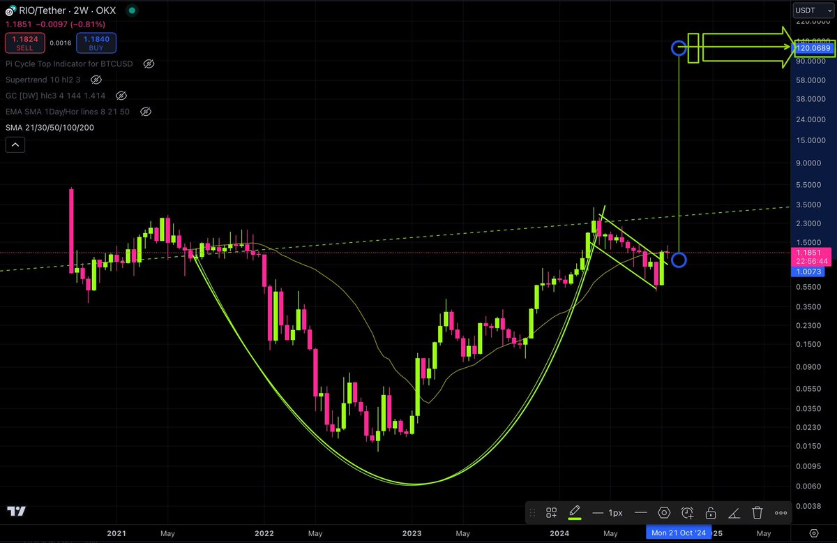 📊📈📈THIS $RIO CHART SAYS📈📈📊 📈RIO Gains 100X FROM todays price 📈 ‼️📈With EVIDENCE IN THE CHART📈‼️ RIO has printed a cup and handle on the two week chart, this cup and handle has been 1022 days in the making. A cup and handle is a powerful reversal pattern especially once it breaks out. If you pay attention to the handle you can see RIO has broken out of its handle, it’s currently moving to retest the handle. The TARGET🎯 Of this cup & handle Is $120 🤯🤯🤯 RIO is $1.18 per coin at time of writing ✍️. Thats 100X easy. I think these are the very last moments to buy CHEAP RIO, once the retest is done and we breakout into Altseason, the potential 100X opportunity will be gone. LOADING UP ON THIS RETEST is the play right now. The #RWA narrative will thrive this cycle and RIO is one of the top names in crypto.