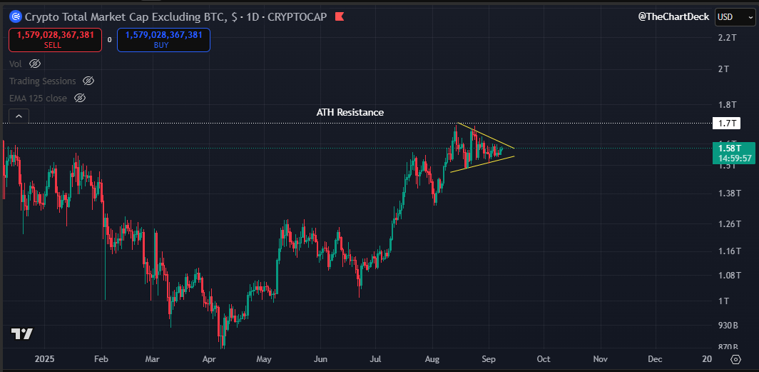 Gm 🌞 It looks like a bullish pennant is forming just under previous ATHs on #Crypto total market cap (excluding $BTC). As this compression nears its end, volatility on $ETH could really start to heat up. I'll be watching this chart closely for either a breakout or breakdown! What do you think we'll see? #Crypto #Ethereum