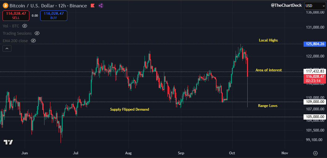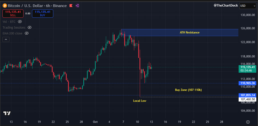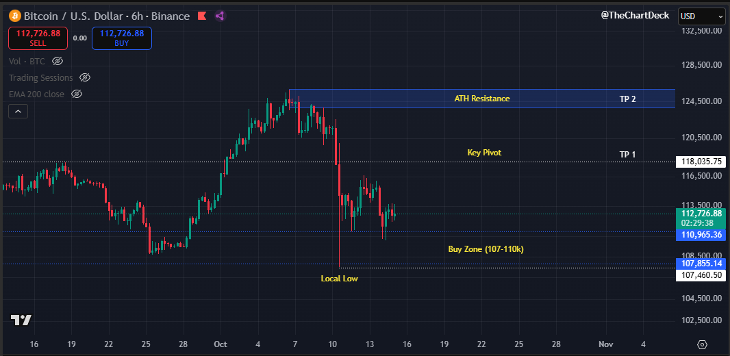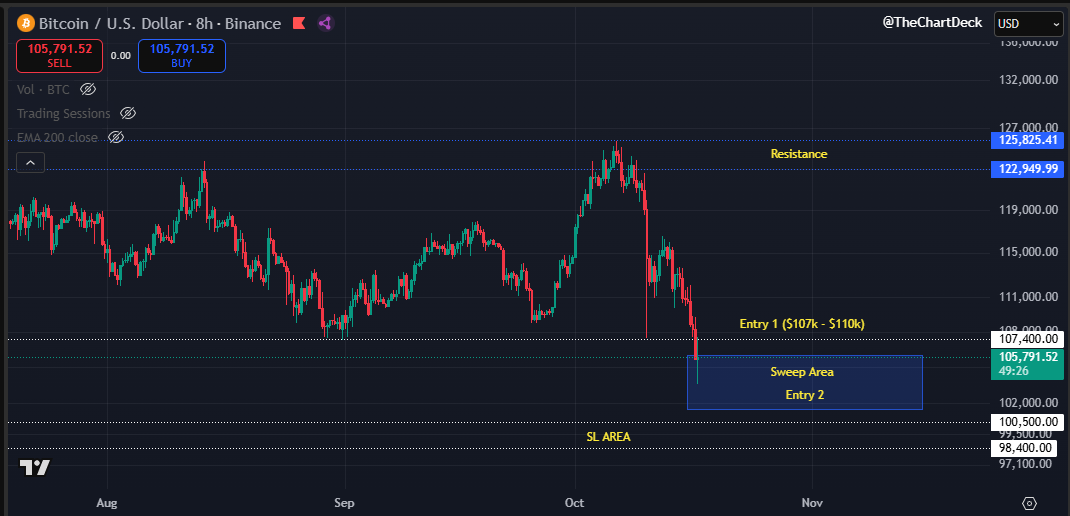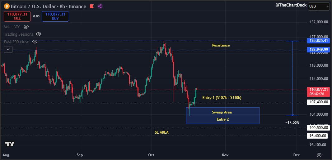 The day after the flash crash I said “don’t get tempted to long too early" That advice was for this exact reason. My initial entry is now at range lows ($107,500) and I’ve started to scale in as we have swept these lows. To make it clear, I’m long here. We could still see a quick sweep into the low 100k’s, but as always on this account, I'm not here to catch the perfect bottom. #Crypto #Bitcoin