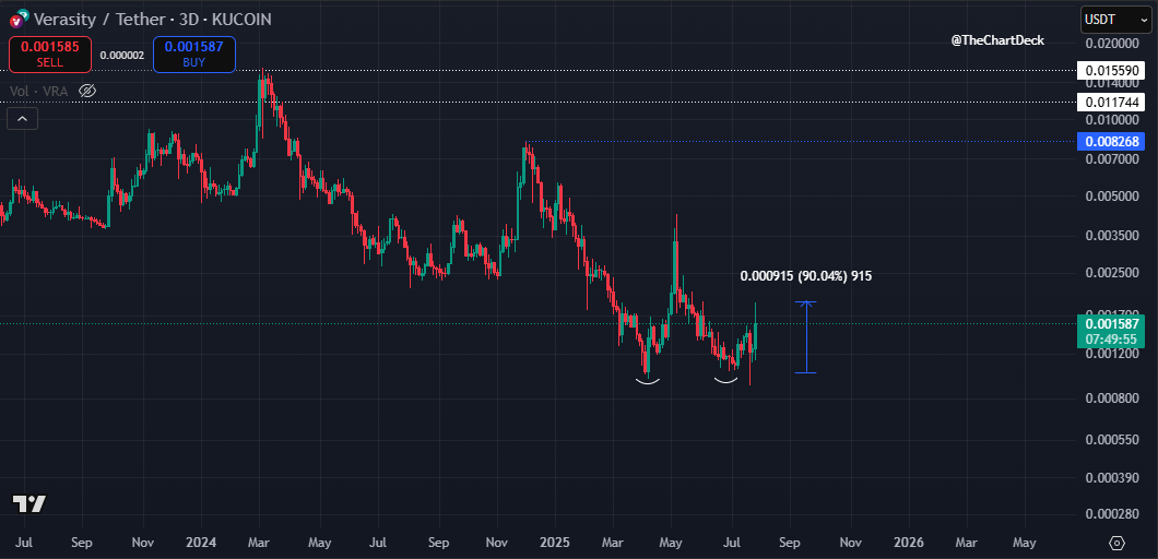$VRA looking interesting here 👀 $VRA is sitting at lows after a heavy sell off from range highs. Even a small allocation here could go a long way if lowcaps like #VRA catch momentum in the later stages of rotation. Putting the project politics aside, from a pure chart + investor perspective, it looks like a solid speculative play. What do you think, bullish on $VRA here? @verasitytech