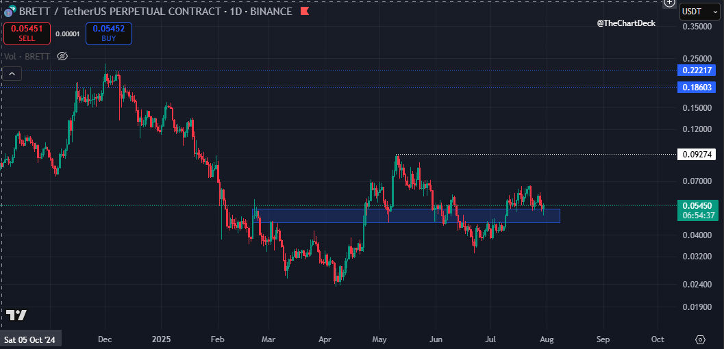 Quick update on $BRETT 👇 #BRETT is holding a really nice area of mid range support here and has withstood the recent #Altcoin volatility well. My initial target is local resistance at $0.092 followed by macro resistance at ATH's. $BRETT seems like a solid meme play heading into the next leg up on #Crypto. What do you think $BRETT community are we heading higher? @BasedBrett