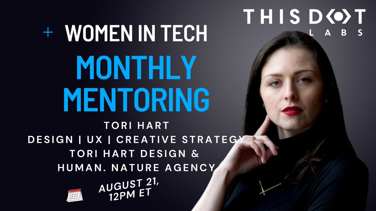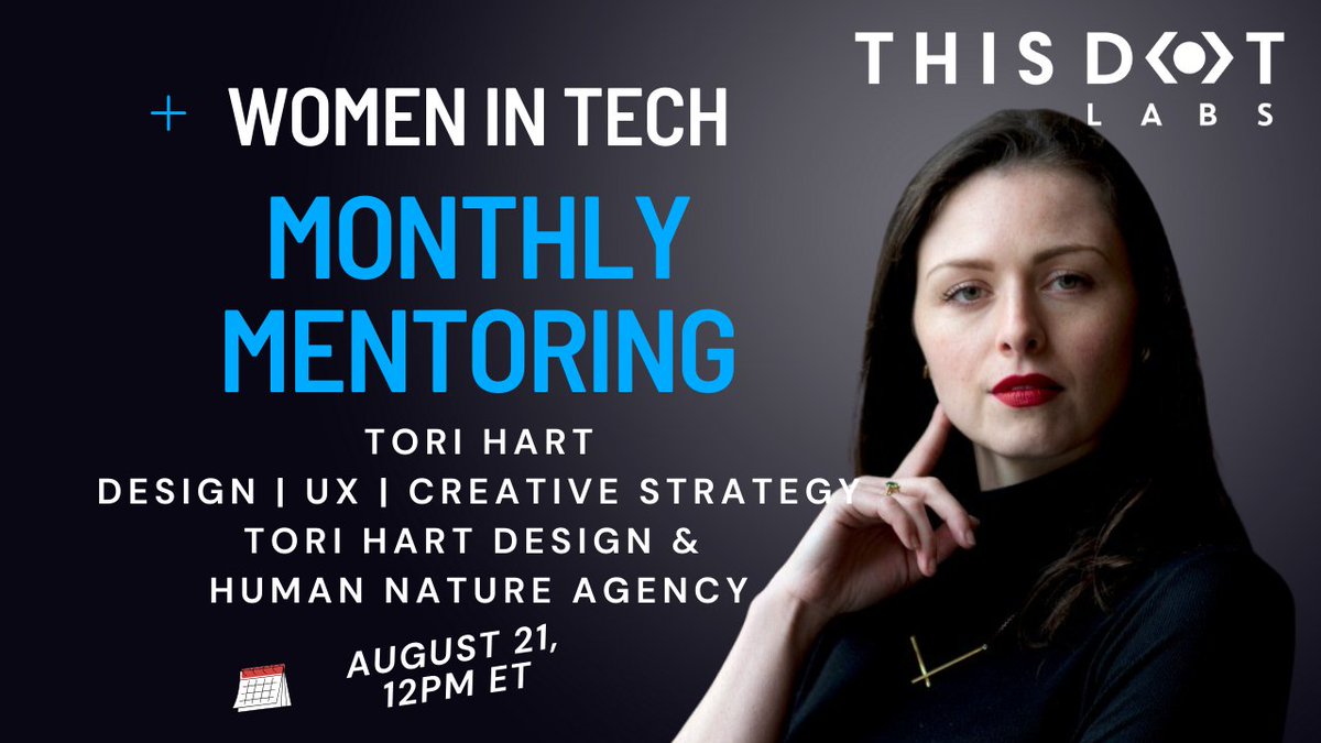 Get ready for the #WomenInTech Monthly Mentorship session, hosted by @ThisDotMedia! This August, we're excited to welcome Tori Hart, a freelance designer and design strategist, who will share her expertise on Design Thinking. Hosted by @eva_trostlos! Whether you've attended before, or not, you are welcomed and encouraged to come! 🗓️ August 21, 12PM ET RSVP women-in-tech.thisdotmedia.com/#/