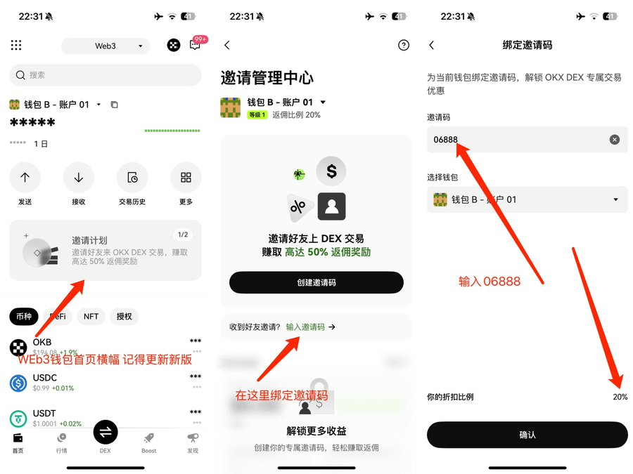 okx boost 教程 保姆级分析一遍,每天奶一篇 上一期Linea刷个几分 算他10u成本 400u利润 下次的二三期,一分就算给个三五u说实话都赚麻了 举个例子 余额留100u左右 每日交易256或者512档 每天磨损2u或者4u 15天就是30u 512就是60u 减去30%的返佣 大家算 一分成本多低 打个比方 一个月吃两次Boost,单号100u 那你刷512的 一个月磨损96u 单号利润104 如果像linea一样 那你单号利润3000u+了 还没注册的可以填一下我的邀请码 :06888 web3.okx.com/join/06888 返佣拉满 20%自动反,10%手反 如果你多号。或者是工作室 可以私信我的TG 我给你提比例 邀请码06888 web3.okx.com/join/06888 TG:t.me/x03310 TG通知群:t.me/+VyvTbU_vFw01Z…