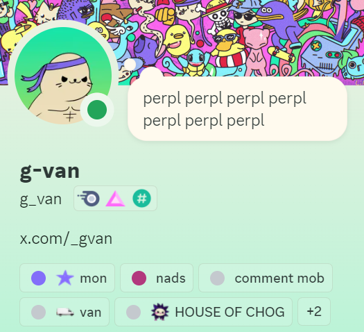 Thankful for receiving the MON role in Monad. Since day 1, I’ve always felt my contributions were recognized and the team always had my back helping me grow, and this is just another example of that. Everything I've done has been because I simply believe Monad can become the future of blockchain tech and accelerate the EVM. And I want to be on the frontlines of that. The team is uniquely positioned to understand what is needed, and execute it. A fast EVM chain that takes no shortcuts (no centralized sequencer, no colocated nodes, runs on commodity hardware, etc). The ideal environment for next gen dapps with real use cases. This is wild if you think about it, so I positioned myself accordingly: - On a personal level, by doing my part to make the monad community a great crypto experience for everyone, building my personal platforms, attending irl events, sharing honest insights from my years in the space, staying proactive, and becoming a loud voice for the community. - On a professional level, by joining @perpltrade, to build what I believe is the next gen for defi. Fully on-chain orderbooks (this is why monad taking no shortcuts matters) with the network effect benefits of a top EVM L1. Beyond thankful for the journey so far and even more excited for the future. Testnet is almost live. headband ON.