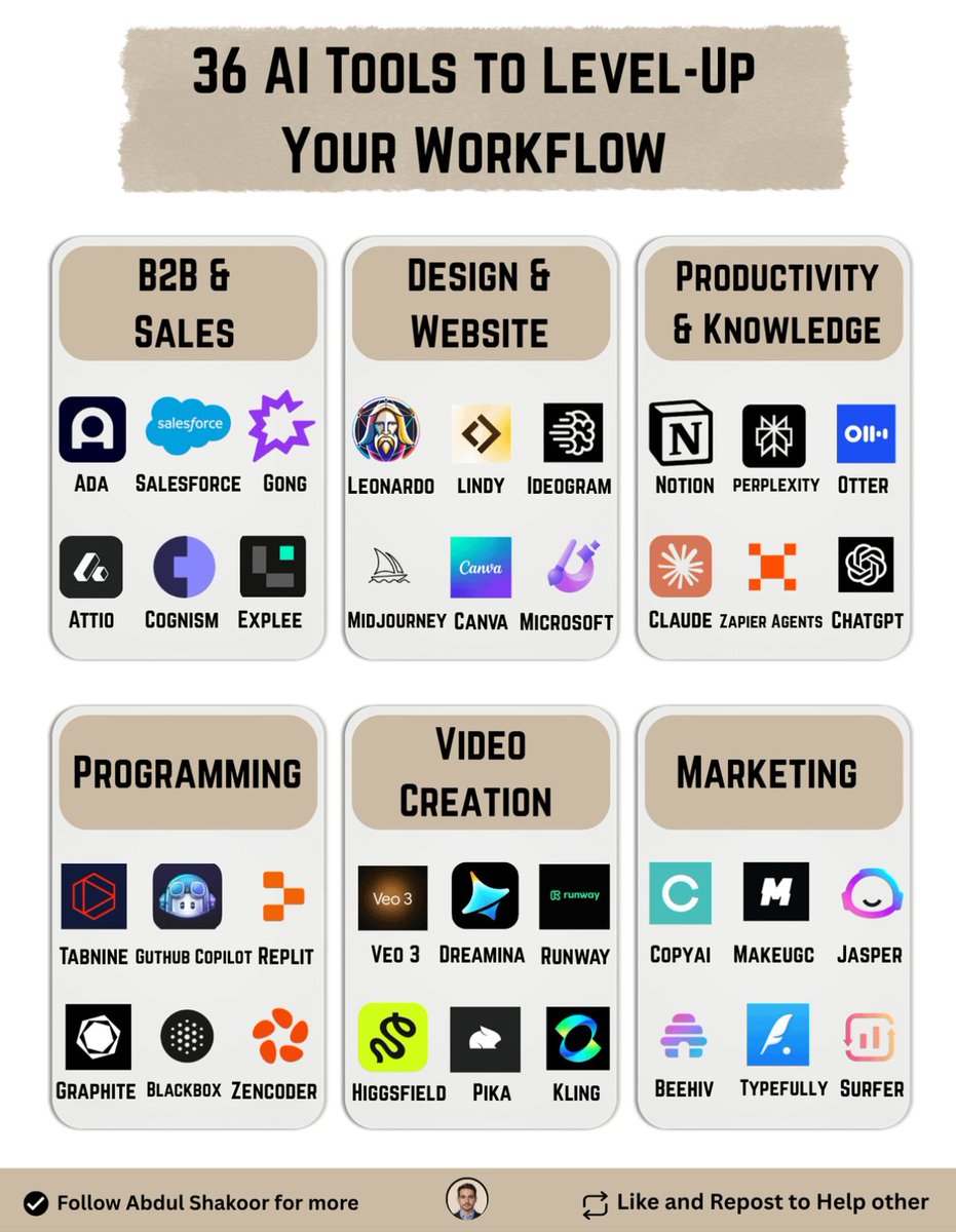 36 AI Tools to Level-Up Your Workflow world’s best Context Playground AI Canvas: flowith.io 1. Sales - Ada - Drift - Attio - Gong - Explee - Cognism - Salesforce 2. Design & Website - Canva - Lindy AI - Leonardo - Ideogram - Adobe Firefly - MidJourney v7 - Microsoft Designer 3. Productivity & Knowledge - Otter AI - Notion AI - ChatGPT-5 - Perplexity Pro - Zapier Agents - Claude Opus 4.1 - BeforeSunset AI 4. Programming - Tabnine - Replit AI - Zencoder - Blackbox AI - Graphite Dev - GitHub Copilot - Sourcegraph Cody 5. Video Creation - Pika 2.2 - Kling 2.1 - Hailuo AI - Higgsfield - Google Veo 3 - Runway Gen-4 6. Marketing - Jasper - Copy ai - Beehiiv - Typefully - MakeUGC - Surfer SEO P.S. Which of these tools do you want to try first?