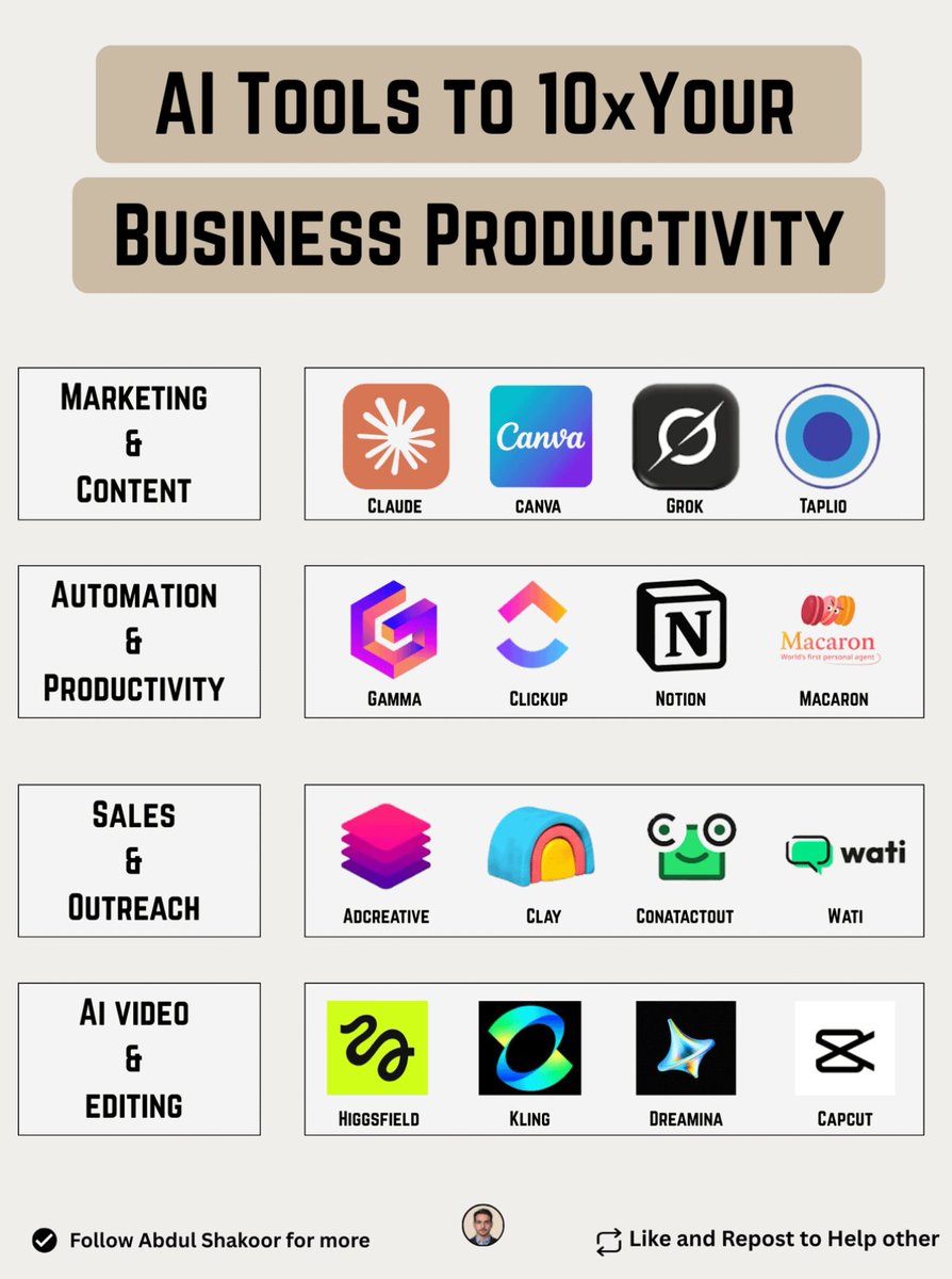 36 AI Tools to Level-Up Your Workflow Create insane video effects higgsfield.ai 1. Sales - Ada - Drift - Attio - Gong - Explee - Cognism - Salesforce 2. Design & Website - Canva - Lindy AI - Leonardo - Ideogram - Adobe Firefly - MidJourney v7 - Microsoft Designer 3. Productivity & Knowledge - Otter AI - Notion AI - ChatGPT-5 - Perplexity Pro - Zapier Agents - Claude Opus 4.1 - BeforeSunset AI 4. Programming - Tabnine - Replit AI - Zencoder - Blackbox AI - Graphite Dev - GitHub Copilot - Sourcegraph Cody 5. Video Creation - Pika 2.2 - Kling 2.1 - Hailuo AI - Higgsfield - Google Veo 3 - Runway Gen-4 6. Marketing - Jasper - Copy ai - Beehiiv - Typefully - MakeUGC - Surfer SEO P.S. Which of these tools do you want to try first?