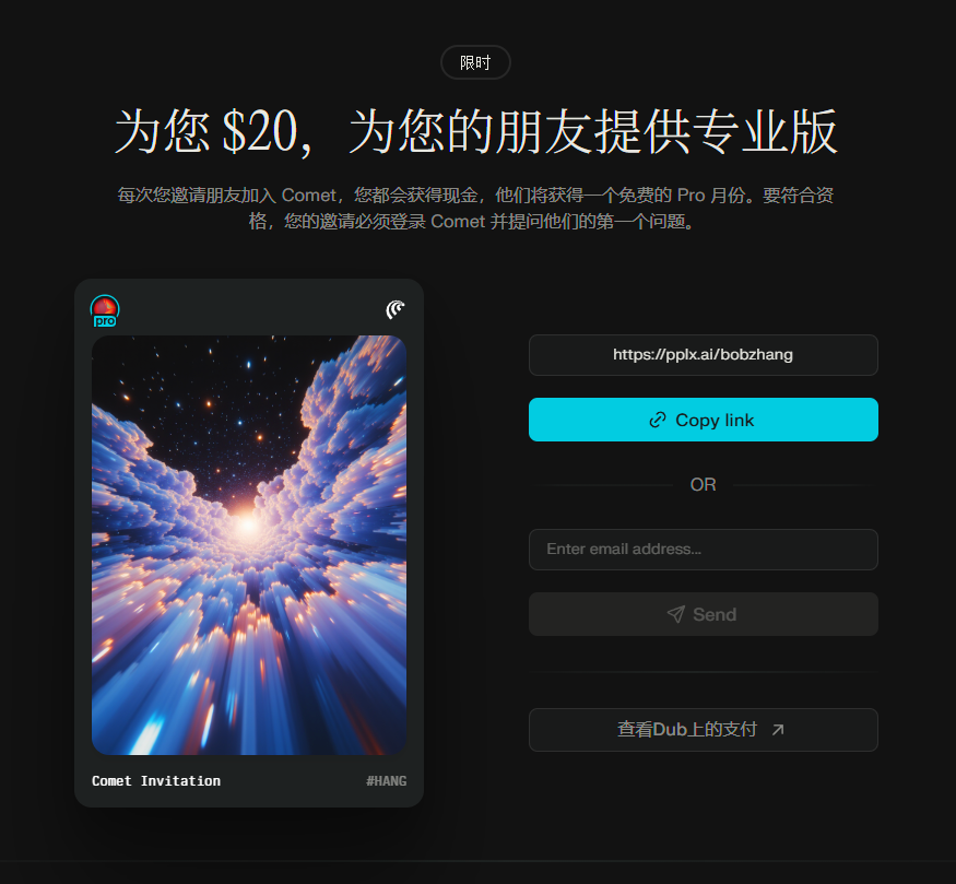 💰 新机会:Comet AI浏览器推广佣金高达$20/人 为什么值得关注? 最近Perplexity推出了自家AI浏览器Comet的官方联盟计划,这波推广预算相当给力。每成功推荐一个用户,佣金最高可达20刀! 推上很多人都在搞,看到有人一天推了1000多刀😂 转化门槛超低: ✅ 下载注册 ✅ 提问一次即算完成 🎁 新用户还送Perplexity会员(大幅提升转化率) 为什么现在是最佳时机? 作为在联盟营销圈摸爬滚打3年多的老玩家(affLIFT论坛 Guru),我已经在论坛发起了讨论。凭经验判断: ⚡ 专业玩家即将入场 → 付费流量竞争会很快抬高获客成本 ⏰ 红利窗口期很短 → 现在用免费流量就能吃到肉 历史总是重复: 每次有app拿到新融资或推广预算,联盟营销圈都会迎来一波狂欢。这次也不例外。 适合哪些人? 🆕 新手: 跑通整个联盟推广流程,积累实战经验 💼 现有流量主: 手上有社交媒体/社群/博客的,轻松变现 🔍 观望者: 手里暂时没项目的,正好练手+赚点零花钱 不需要投流技术,用现有资源(朋友圈/社群/自媒体)就能开始。 一起交流成长 通过我的链接注册后,欢迎加我好友深度交流: 分享实战转化技巧 讨论流量渠道优化 海外联盟营销最新动态 👉 我的链接: pplx.ai/bobzhang PS:这是Perplexity官方计划,靠谱稳定,不用担心跑路问题 ✅