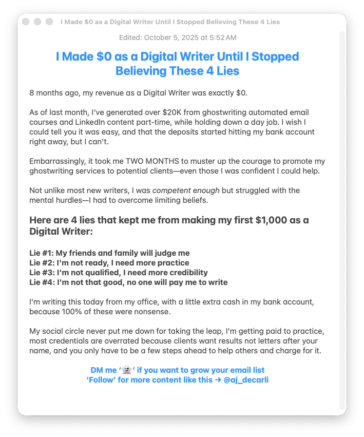 AJ's biggest win is successfully ghostwriting educational email courses that help endurance running coaches improve their businesses, all while achieving personal milestones like finishing the CIM marathon four times and embracing growth challenges head-on.
