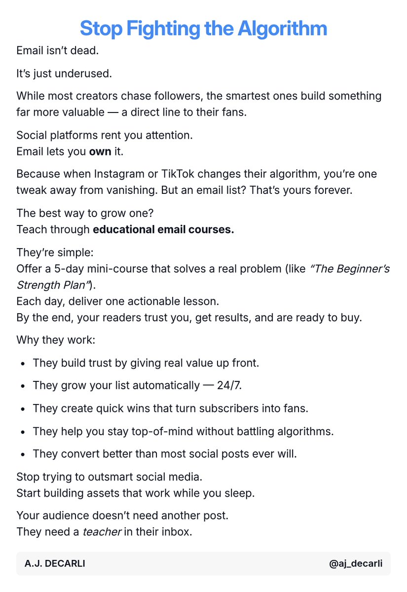 AJ DeCarli is a passionate endurance runner and skilled educational writer who thrives on building in public and helping coaches excel through impactful email courses. With a solid dedication to personal growth and clear values guiding his journey, AJ embraces challenges both on the track and behind the keyboard. His authentic, thoughtful content resonates with a community eager to learn and grow alongside him.
