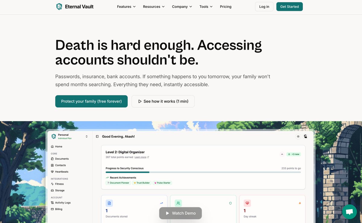 Today's the day! 🚀 After 3 to 4 months of grinding every weekend and evening outside my day job, I'm launching Eternal Vault to the world. The grind was real • Every evening after work designing the architecture • Every weekend coding • Reached out and got 103 beta users to test and get feedback Beta results that kept me motivated • 89% of users didn't need any input from me to use the full platform end to end. • "This would have saved us months of pain" - most common feedback • "I never thought about how serious this problem was" - another common feedback What makes me proudest This isn't just another SaaS. Sure, you could "just share passwords offline", but how many actually do it? And does it right? • Do you update that list every time you change a password? • How do they access it only AFTER you're gone (not before)? • What about new accounts you create? • Is that document even findable when they need it? Most people think they'll do it "someday" but never do. This makes it automatic. To celebrate, I'm offering a 50% discount for the first 100 users. **LAUNCH50** - 50% off for first 100 users. 🎉 Every family deserves better than the digital chaos that happens when someone passes. 🔗 Try free: eternalvault.app 💰 Discount Code: LAUNCH50 (first 100 users) 📧 Questions: akash@eternalvault.app Let's protect the families we care about.