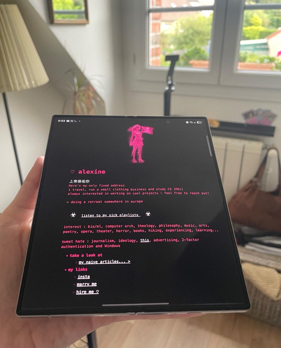 Fun fact: Alexine didn’t just quit fashion but pivoted to mastering low-level programming — and broadcasts candid 'slop' about their programming adventures with a pirate flag emoji as their signature.