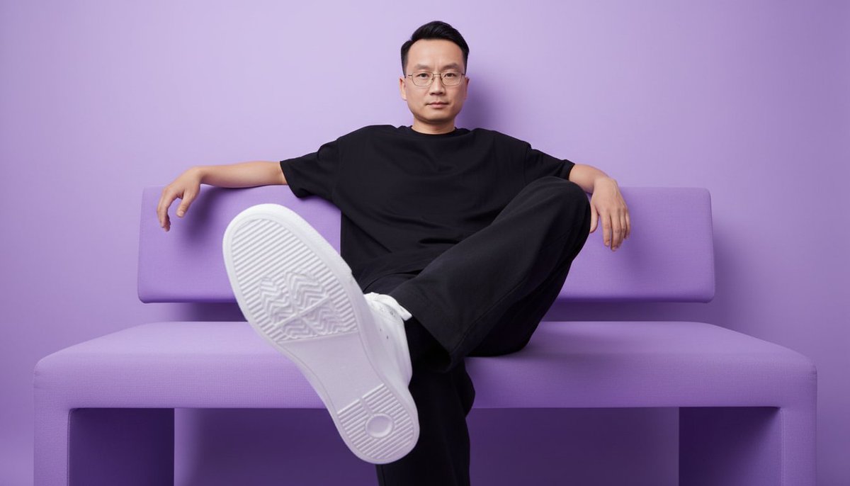 Use the submitted photo as an identity reference. Preserve 100% of the person’s face and identity in the photo; do not alter their individual appearance. Create a realistic editorial portrait of a person sitting on a bright purple bench in a minimalist studio setting. The person is wearing an oversized black t- shirt, black pants, and crisp white sneakers. Pose: The person is sitting casually, leaning back slightly, with one arm resting on the back of the bench and the other relaxed on their leg. A sneaker is extended toward the camera, dominating the foreground with the sole clearly visible, creating a strong perspective effect. Background: Plain lilac/purple background, without text, logos, or graphic elements. Lighting: Soft studio lighting with balanced highlights and shadows, highlighting the textures of the clothing, sneakers, and bench without creating strong contrasts. Camera and composition: 4:5 vertical portrait, low-angle perspective. Wide-angle lens (20-28mm) that highlights the shoe in the foreground, keeping the subject’s face and posture sharp and in proportion. Setting: Minimalist studio with a monochromatic style, ensuring that the purple tones of the bench and background dominate the scene. Cons: Do not alter the face or identity, add text, logos, or watermarks, leave no clutter in the background, or distort the shoes or body proportions beyond the natural wide-angle perspective. Quality: Ultra-realistic, high- resolution studio portrait, bold monochromatic aesthetic with striking perspective. Final result in 4K. @NanoBanana_labs