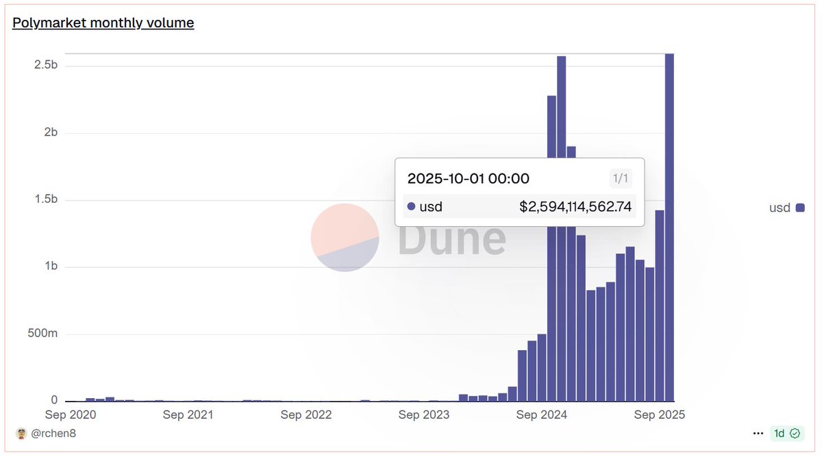 Polymarket monthly volume in October was the highest ever recorded This month's trading volume was $2.59 billion, which is $22 million more than in November 2024 (the 2nd ATH) Every month traders' interest to Polymarket is growing, and in my opinion, the ATH will be updated in the coming months Imagine the faces of those who said that @Polymarket would be useless after the US presidential election Polymarket supercycle