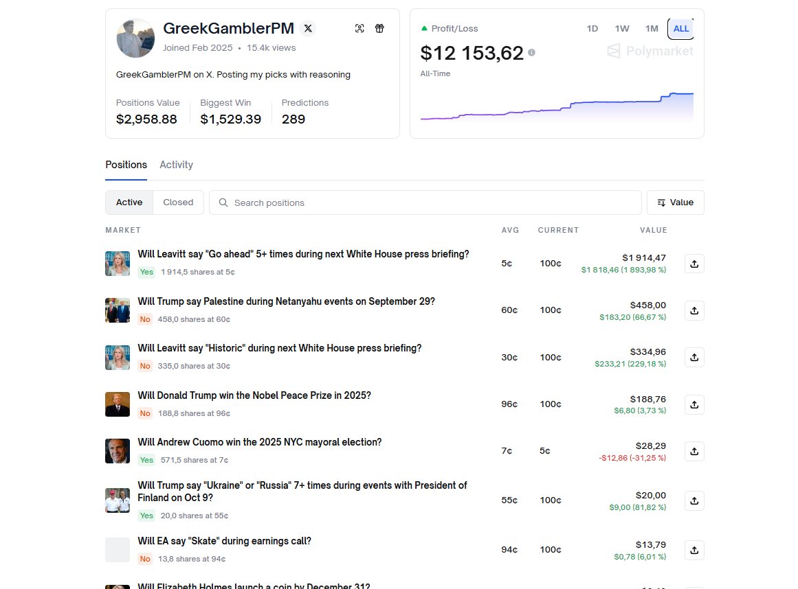 Another incredible story of a trader on Polymarket - @GreekGamblerPM This guy started in February with just $150 and in less than a year increased his deposit by more than $12k Besides being a super trader, he is also an excellent content creator on X (check his profile) I am inspired by traders who have been able to increase their initial small deposits several dozen times just by trading on Polymarket and there are many more examples like this btw link to GreekGambler profile below 👇