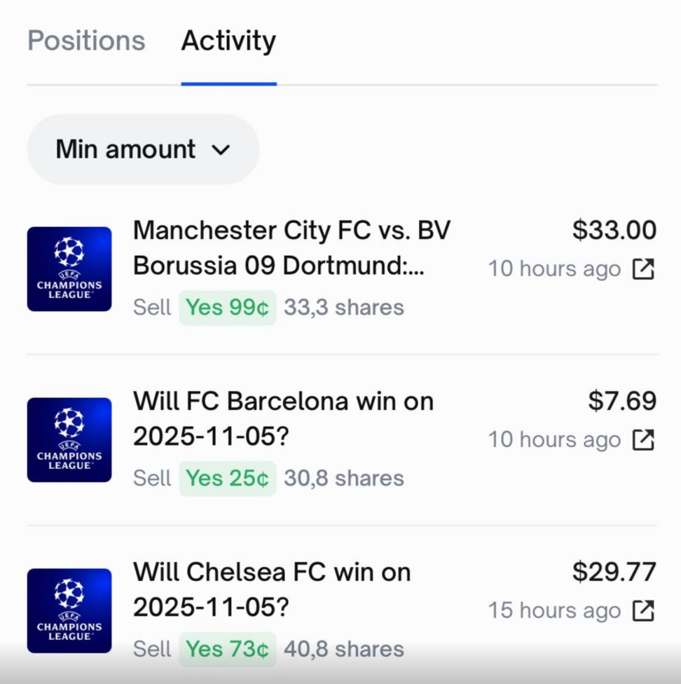 Good morning It's a good thing I gave up on sports predictions on @Polymarket These events are harder to predict than what Trump will do ngl Yesterday, I barely managed to sell my bets at 0: > I sold my bet on Chelsea when they announced that the second team would be playing (-5%) > I sold my bet on Barcelona when the score was 3:3 (-60%) > Well, the bet on Manchester City vs. Borussia is the only one that was successful (+66%) In the end I came out ~break-even but i think I've had enough of sports betting for the next month
