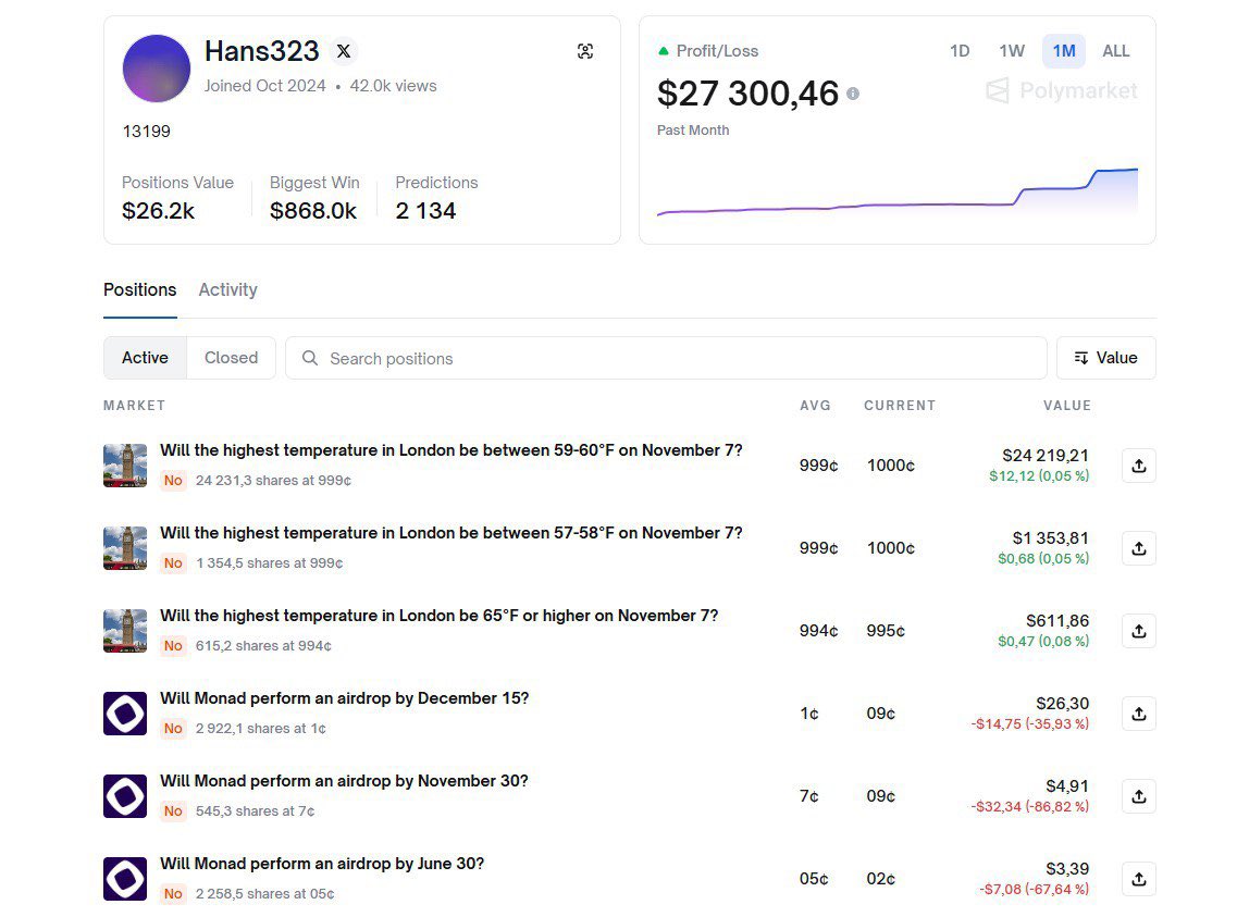This guy turned $13.59 into $9,600 two days ago by trading on the weather on Polymarket Polymarket trader Hans323 predicted that the highest temperature in London on November 4 would be 63-64°F, and he was right Here is his Polymarket profile - @Hans323?via=izlam">polymarket.com/@Hans323?via=i… This isn't his first such trade: shortly before that, he also won $8,700 trading on the weather with a bet of only $125 He ranks first in the monthly leaderboard, and his PNL for the month is over $27k He also has a profile on X - @Hans323PM, where he talks about his trading results I really recommend following to him and following his profile on @Polymarket I think his biggest wins are yet to come