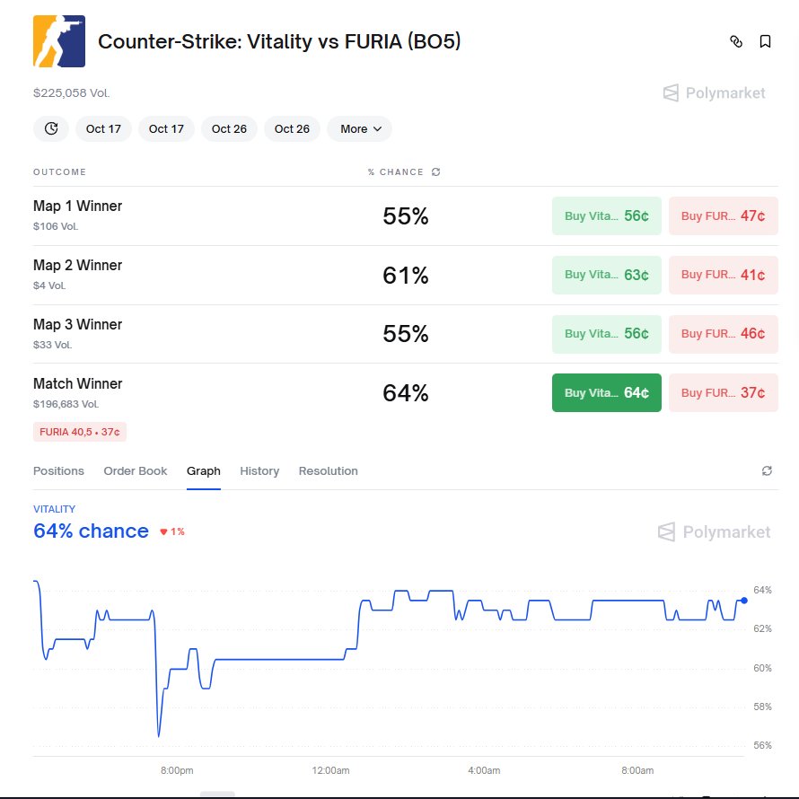 Good morning I started the morning with a small and risky prediction on @Polymarket Today is the final of the CS2 tournament IEM CHENGDU 2025 Vitality will face Furia, and the winner will take home the $125,000 prize for first place I bet on Furia, even though Vitality are the favourites, because I found the odds more attractive But Furia are also in great form (especially Molodoy), so they could win this match, but I still think Vitality have a better chance