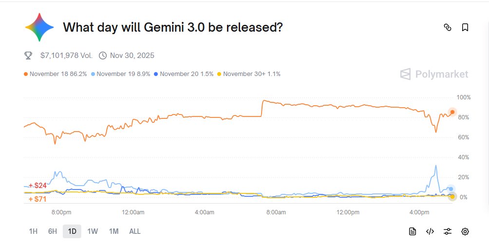 Will Gemini 3.0 be released today? Because of the Cloudflare outage, the probability of a Gemini 3.0 launch briefly dropped to 65% But then quickly recovered back above 85%, according to @Polymarket Link - polymarket.com/event/what-day… At one point, the odds for November 19 even jumped to almost 33%, but they have now fallen again It seems that the glitch did not affect Google's plans, so Polymarket traders still believe Gemini 3.0 will be released today What do you think guys?