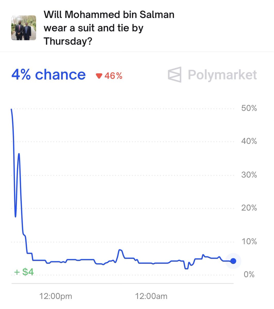 Good morning Yesterday, during Trump’s meeting with the Saudi Crown Prince, the Prince casually mentioned a “bidding site” where people bet on whether he’ll wear a suit or not Everyone knows what he meant - @Polymarket Polymarket doesn’t just predict the future anymore - it actually sets it now Wild times