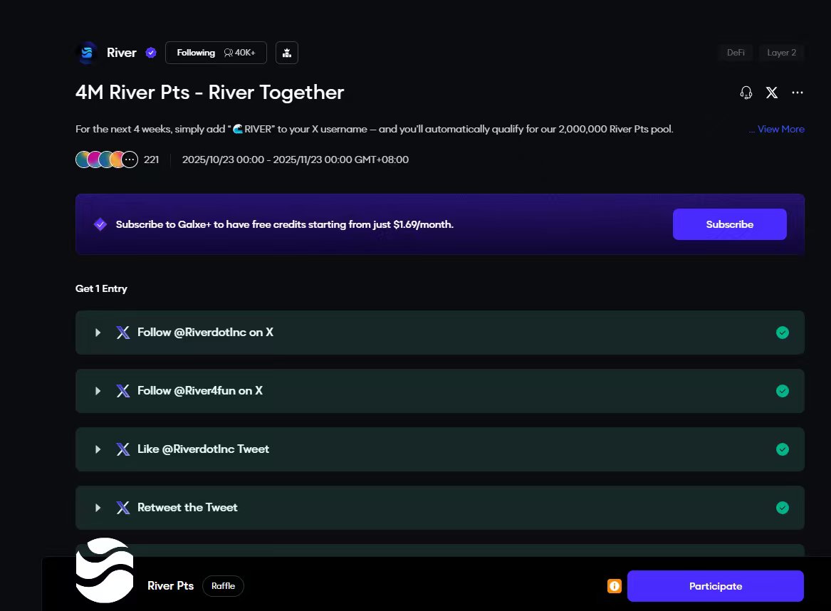 이번@Galxe 퀘스트는 절대 놓쳐서는 안 됩니다. 강과 함께 4M RiverPts를 나눠받으세요!