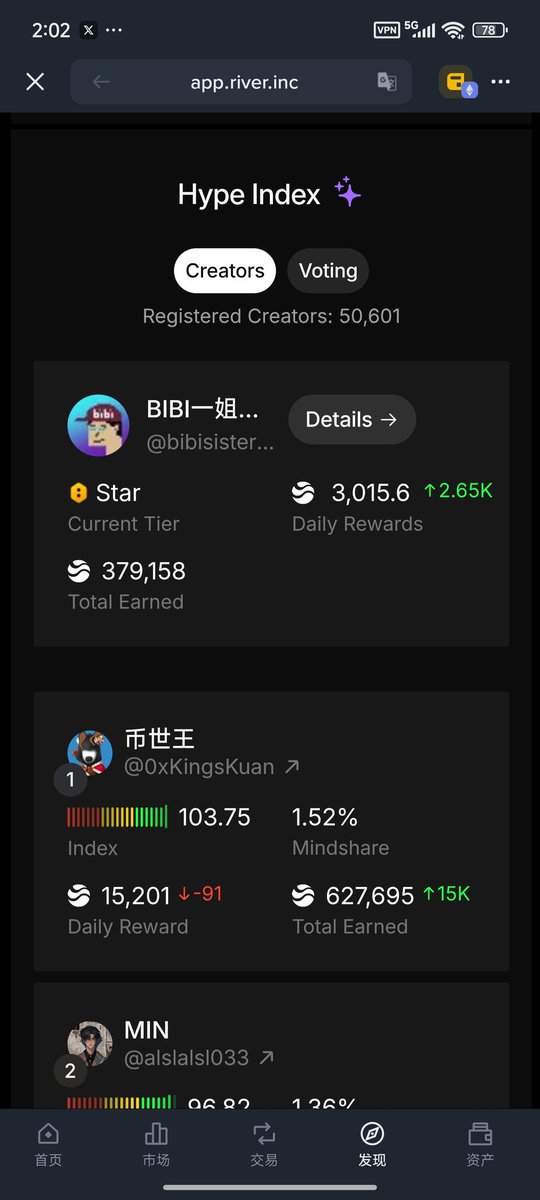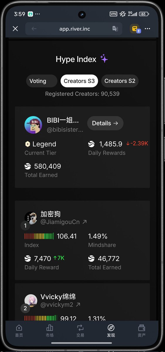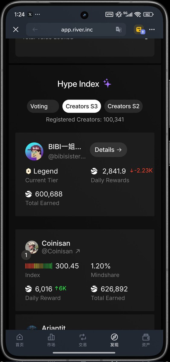 昨晚在添加🌊RIVER 標簽的時候,順便將 #rivers S2 Creator Top1 的身份證再加上了!這不是顯耀,而是自我的肯定 肯定自己在 $RIVER 上小半年的辛勤付出的結果 !
