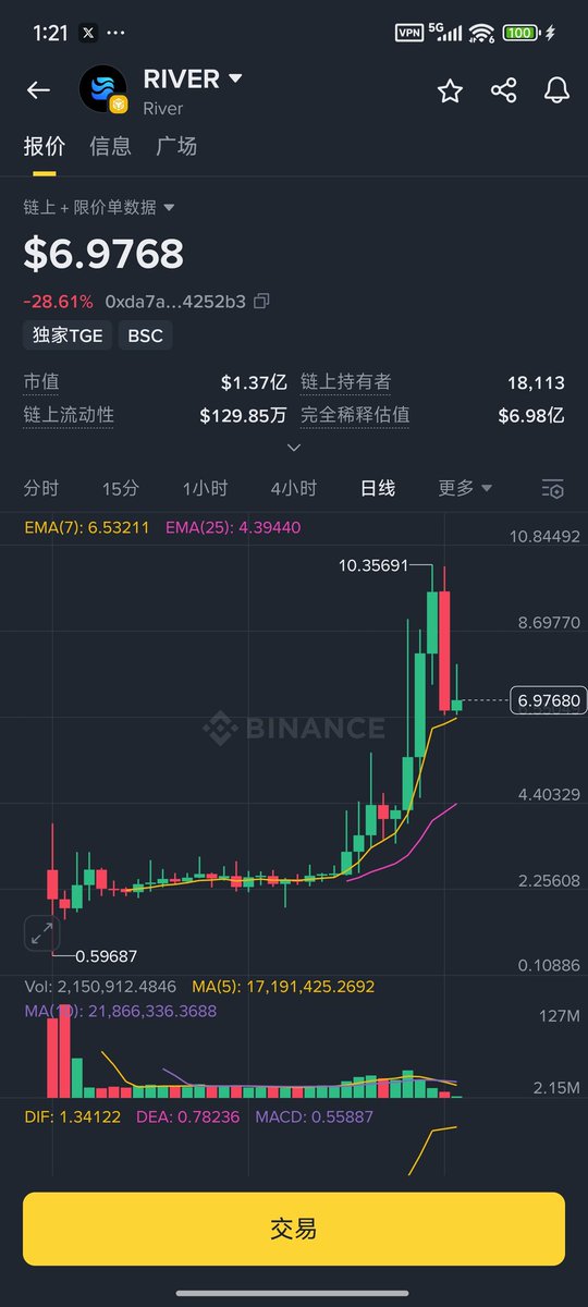 零晨的时候 $RIVER 迎来一次比较大的回调,最低下探到 6.6U , 现在来到 7U 支撑位 ,回调结束, $RIVER 继续往前冲💪 (乔帮主 @Joensmoon 抄底成功🥰🥰)
