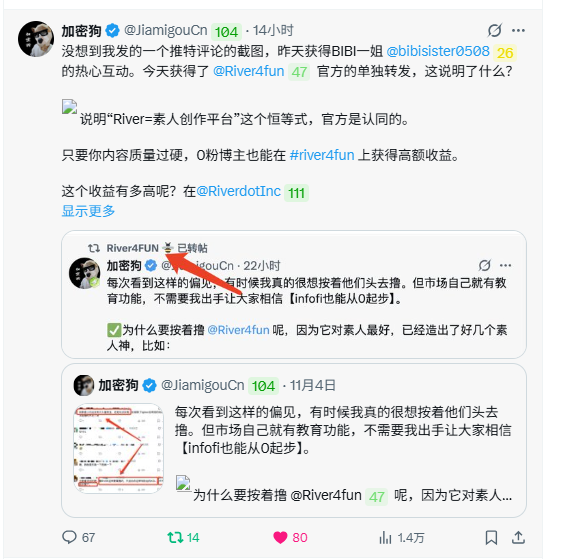 🎁 官文推出 4M RiverPts 签加“ 🌊RIVER ”标签仅仅两天时间,现在推特上突然到处都可以刷到河流的家人! $RIVER 的声浪🌊真的像河流一样,一浪🌊接一浪🌊 !这策划真的非常的高明,给 River 团队加鸡腿🍗