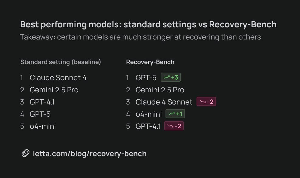 Today we're excited to release our latest research at @Letta_AI on Recovery-Bench, a new benchmark for measuring how well model can recover from errors and corrupted states.