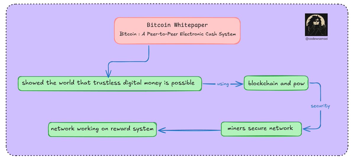 {"data":{"__meta":{"device":false,"path":"/creators/codewsensei"},"/creators/codewsensei":{"data":{"user":{"id":"1851937891641094144","name":"CodeWsensei","description":"perp trading to earn, coding for passion","followers_count":766,"friends_count":344,"statuses_count":1202,"profile_image_url_https":"https://pbs.twimg.com/profile_images/1957410189315076096/vf_IeWRe_normal.jpg","screen_name":"codewsensei","location":"","entities":{"description":{"urls":[]}}},"details":{"type":"The Analyst","description":"CodeWsensei is a data-driven perpetual trader and passionate coder who thrives on breaking down complex crypto concepts with clarity and precision. They combine technical expertise with practical trading insights to educate and engage their audience. Their methodical approach reveals a mind always seeking to understand and optimize.","purpose":"To demystify complicated financial and technological concepts, empowering their community with knowledge and strategies that turn trading and coding into profitable and fulfilling pursuits.","beliefs":"They believe in transparency, trustless systems, and the power of blockchain technology to disrupt traditional finance. They value precision, continuous learning, and the practical application of knowledge to achieve real-world success.","facts":"Fun fact: CodeWsensei once distilled the entire Bitcoin whitepaper into an eloquent, bite-sized tweetstorm that drew almost 1,400 views and sparked meaningful discussion.","strength":"Exceptional ability to analyze and communicate intricate ideas clearly, backed by deep technical knowledge and a disciplined approach to trading and coding.","weakness":"May come across as overly technical or detail-heavy, potentially intimidating casual followers or diluting engagement for a broader audience.","roast":"CodeWsensei probably has a love-hate relationship with their own tweet draftsâspending hours perfecting clarity, but forgetting half the world just wants a meme or a punchline.","win":"Successfully cultivated a dedicated niche audience interested in crypto and trading insights, evidenced by high engagement on educational threads despite modest follower count.","recommendation":"To grow on X, CodeWsensei should blend their analytical strengths with more relatable, conversational contentâlike quick tips, humor-infused threads, and interactive pollsâto broaden appeal while retaining authority."},"tweets":[{"bookmarked":false,"display_text_range":[0,279],"entities":{"hashtags":[],"media":[{"display_url":"pic.x.com/TRSaSfunaj","expanded_url":"https://x.com/codewsensei/status/1972190595092287705/photo/1","id_str":"1972188405774626816","indices":[280,303],"media_key":"3_1972188405774626816","media_url_https":"https://pbs.twimg.com/media/G16e5-xXMAA3ZjO.jpg","type":"photo","url":"https://t.co/TRSaSfunaj","ext_media_availability":{"status":"Available"},"features":{"large":{"faces":[]},"medium":{"faces":[]},"small":{"faces":[]},"orig":{"faces":[]}},"sizes":{"large":{"h":696,"w":1561,"resize":"fit"},"medium":{"h":535,"w":1200,"resize":"fit"},"small":{"h":303,"w":680,"resize":"fit"},"thumb":{"h":150,"w":150,"resize":"crop"}},"original_info":{"height":696,"width":1561,"focus_rects":[{"x":0,"y":0,"w":1243,"h":696},{"x":2,"y":0,"w":696,"h":696},{"x":45,"y":0,"w":611,"h":696},{"x":176,"y":0,"w":348,"h":696},{"x":0,"y":0,"w":1561,"h":696}]},"media_results":{"result":{"media_key":"3_1972188405774626816"}}}],"symbols":[],"timestamps":[],"urls":[],"user_mentions":[]},"extended_entities":{"media":[{"display_url":"pic.x.com/TRSaSfunaj","expanded_url":"https://x.com/codewsensei/status/1972190595092287705/photo/1","id_str":"1972188405774626816","indices":[280,303],"media_key":"3_1972188405774626816","media_url_https":"https://pbs.twimg.com/media/G16e5-xXMAA3ZjO.jpg","type":"photo","url":"https://t.co/TRSaSfunaj","ext_media_availability":{"status":"Available"},"features":{"large":{"faces":[]},"medium":{"faces":[]},"small":{"faces":[]},"orig":{"faces":[]}},"sizes":{"large":{"h":696,"w":1561,"resize":"fit"},"medium":{"h":535,"w":1200,"resize":"fit"},"small":{"h":303,"w":680,"resize":"fit"},"thumb":{"h":150,"w":150,"resize":"crop"}},"original_info":{"height":696,"width":1561,"focus_rects":[{"x":0,"y":0,"w":1243,"h":696},{"x":2,"y":0,"w":696,"h":696},{"x":45,"y":0,"w":611,"h":696},{"x":176,"y":0,"w":348,"h":696},{"x":0,"y":0,"w":1561,"h":696}]},"media_results":{"result":{"media_key":"3_1972188405774626816"}}}]},"favorited":false,"lang":"en","possibly_sensitive":false,"possibly_sensitive_editable":true,"retweeted":false,"fact_check":null,"id":"1972190595092287705","view_count":1334,"bookmark_count":2,"created_at":1759041854000,"favorite_count":15,"quote_count":1,"reply_count":8,"retweet_count":1,"user_id_str":"1851937891641094144","conversation_id_str":"1972190595092287705","full_text":"Day 7 : Bitcoin Whitepaper\n\nBitcoin whitepaper have its name- âBitcoin: A Peer-to-Peer Electronic Cash Systemâ, showed the world that trustless digital money is possible\n\nKey points given in whitepaper :\n\n1. Double Spending Problem-Early digital currencies allowed copying coins for multiple spends, like file copies. Banks verified but required trust. Satoshi proposed a trustless system with calculation based verification, no central authority.\n\nSolution: Blockchain + Proof of Work-Store all transactions in a distributed public ledger to prevent manipulation. Uses PoW for consensus for miners to solve complex puzzles with computing power, first solver adds the block through mining, then get rewarded\n\n2. Transactions- Transactions form a chain of digital signatures (nonce). Sender signs with private key, receiver attaches it with their public key for further spending.\n\n3. Timestamp Server-Blocks contain transaction sets + prior block's hash, creating an immutable blockchain sequence.\n\n4. Proof of Work- Solve hash puzzles at set difficulty to add blocks. Makes mining costly and ledger tamper-proof\n\n5. Network- Nodes connect peer-to-peer 