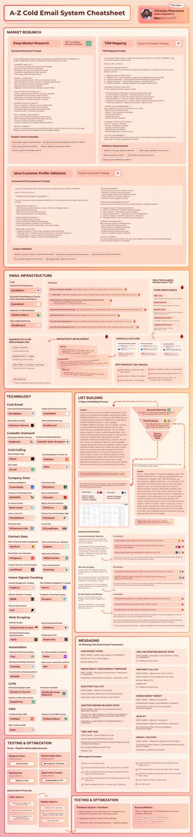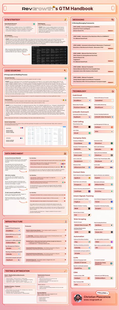 Christian routinely sends between 100,000 to over 1,000,000 cold emails monthly, and offers free and paid guides on mastering outbound email strategies. He provides detailed frameworks such as a 115-step GTM playbook and a 51-step outbound strategy diagram, combining AI tools and best-in-class processes to ensure 98% email deliverability.