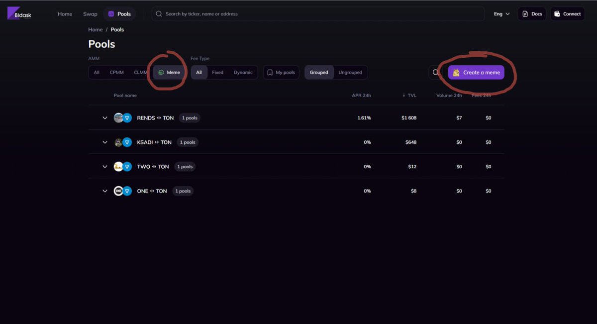 The new "Meme" section in Bidask’s Pools lets you explore all meme-related liquidity pools powered by the same AMM core as the main DEX.
