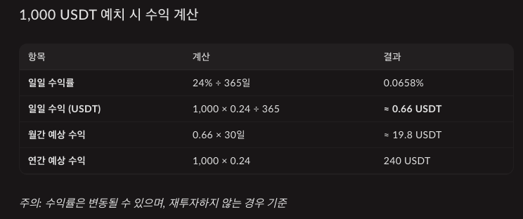 이는 하루 0.0658% 정도의 수익률로 계산이 가능합니다. 1000테더면 하루 0.66불의 수익이 가능한거죠. 이는 한달에 20달러 정도로 계산이 가능한데요.