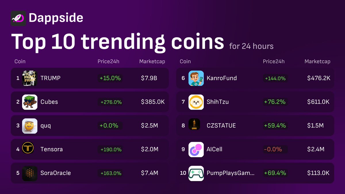 🔥Top 10 Trending #DappSide 1. $TRUMP @GetTrumpMemes 2. $Cube @solana_cube 3. $quq @Binance_quq 4. $TORA @TensoraL2 5. $SORA @SoraOracle 6. $KANRO @KANRO_ETH 7. $Shih @ShihBSC 8. $CZSTATUE @CzStatue 9. $AICell @AICell_World 10. $PLAY @PumpPIaysGames 👉App - dappside.io 🤖Trending Bot - t.me/dappside_token…