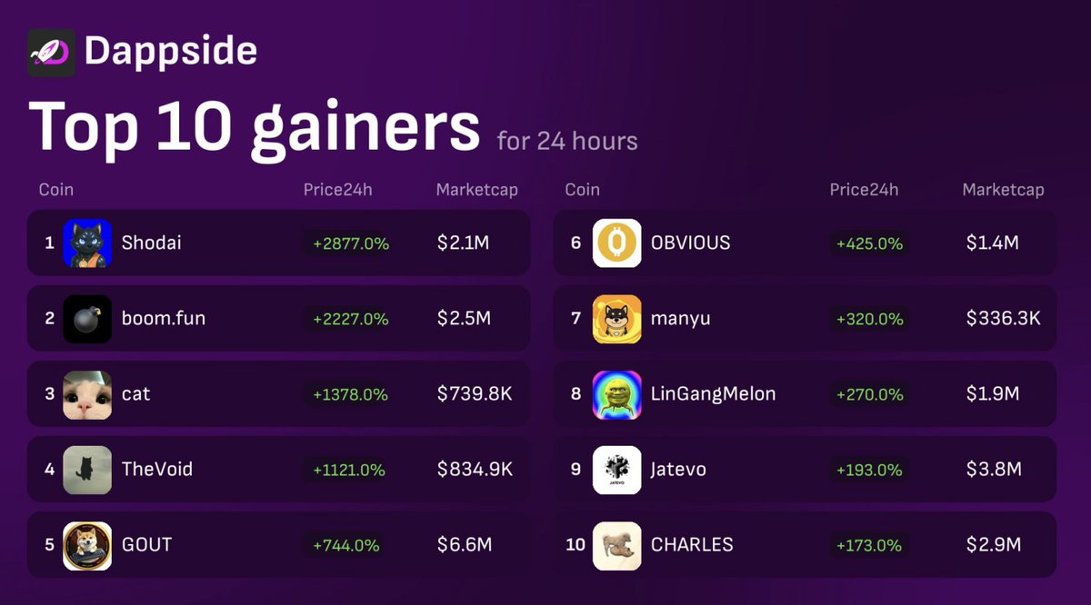 🔥Top 10 Gainers #DappSide 1. $SHODAI @ShodaiOnBase 2. $BOOM @boomdotfun 3. $cat @catmemesolana 4. $void @OGPrimaere 5. $GOUT @GOUTCOIN 6. #OBVIOUS @BlinkOnChain 7. $manyu @manyubsc 8. #Lingang @lingangmelonsol 9. $JTVO @JatevoId 10. $KING @1liax3 👉App - dappside.io 🤖Trending Bot - t.me/dappside_token…