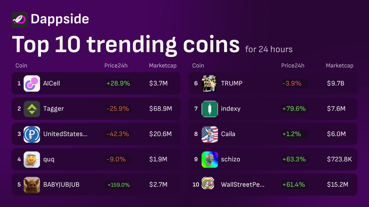 🔥Top 10 Trending #DappSide 1. $AICell @AICell_World 2. $CSTAR @CoinStarHQ 3. $TAG @taggerai 4. $retard @retardcoin42069 5. $CA @Caila_AI 6. #Lingang @lingangmelonsol 7. $DOODi @doodipals 8. $TRUMP @GetTrumpMemes 9. $OSCAR @brenthewolf 10. $BC @BC_CTOCZ 👉App - dappside.io 🤖Trending Bot - t.me/dappside_token…