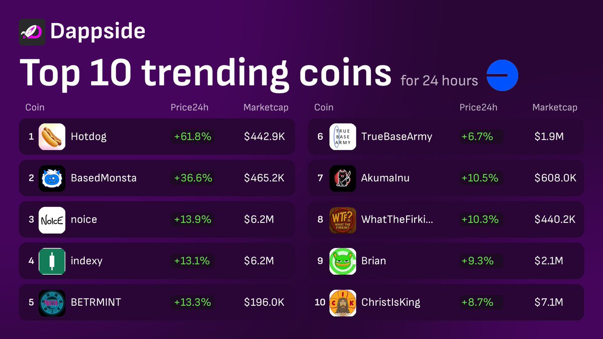 🔥Top 10 Trending #DappSide #BASECHAIN 1. $HOTDOG @log_a_dog 2. $MONSTA @BasedMonsta 3. $noice @noicedotso 4. $i @indexy_xyz 5. $BETR @betrmint 6. $TBA @TrueBaseArmy 7. $AKUMA @akumainuprime 8. $WTF @whatthefirkin 9. $BRIAN @OnBaseBrian 10. $CIK @ChristIsKing_io 👉App - dappside.io 🤖Trending Bot - t.me/dappside_token…