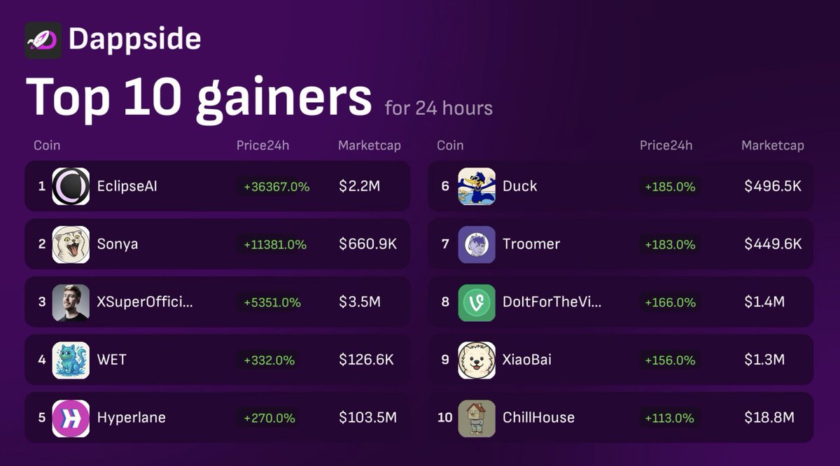 🔥Top 10 Gainers #DappSide 1. #ECLIPSE @EclipseAiOnEth 2. $SONYA @SonyaCatonETH 3. #MrBeast @richfaso 4. $WET @WET_sui 5. $HYPER @hyperlane 6. $DUCK @Duck_TOKEN_ 7. #TROOMER @Troomer_ 8. $VINE @piques15 9. #XIAOBAI @xiaobai_cto_eth 10. #CHILLHOUSE 👉App - dappside.io 🤖Trending Bot - t.me/dappside_token…