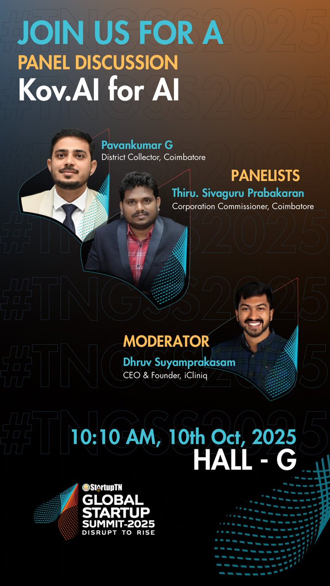 Happy to moderate a session with the respected District collector of Coimbatore, Thiru. Pavankumar G Giriyappanavar IAS and respected Corporation Commissioner, Thiru Sivaguru Prabakaran IAS Coimbatore today from 10.10 am onwards at Hall G of Codissia at the Tamil Nadu Global Startup Summit. It’s about how do we make KovAI as an AI hub. An example of some questions that are poised to be answered today. 1. Coimbatore in 2030 as the AI capital of India, what would be the three visible signs of that transformation? 2.Coimbatore’s strengths like engineering talent, manufacturing, healthcare, textiles becoming global AI showcase? Which sector can be the ‘first mover’? @TheStartupTN @pavankumar_gg @CollectorCbe @SivaguruIAS @simplicitycbe @tweetKishorec @aprsiva